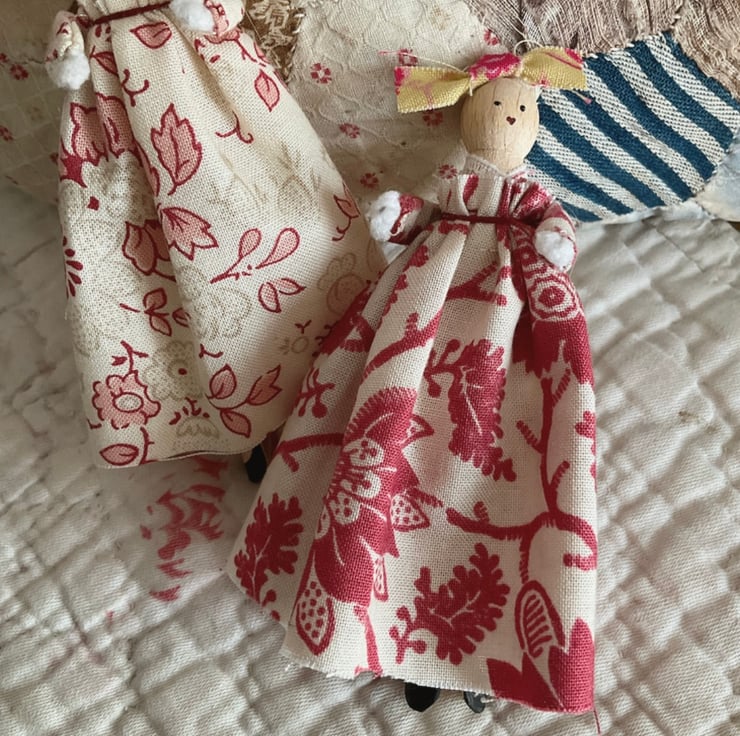 A gorgeous pair of peg dolls in coordinating dresses, made from Moda, French General fabric, with a tiny lace bodice.