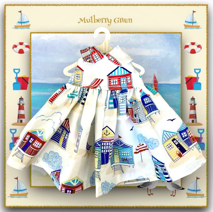 A little white dress in a beach huts print, to fit the Mulberry Green characters. The dress has a Peter Pan collar and a lined bodice. Perfect for the seaside.