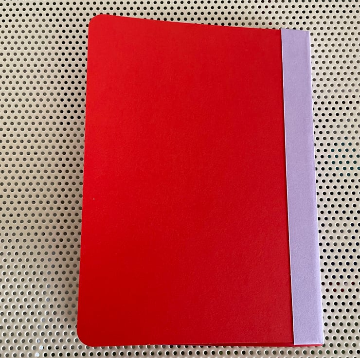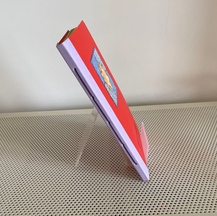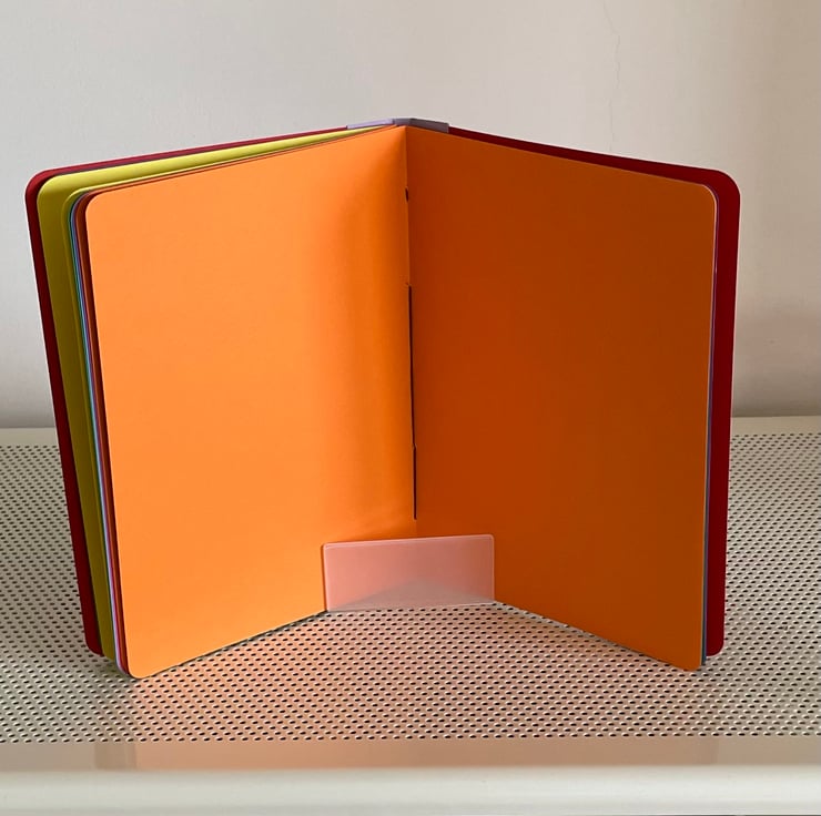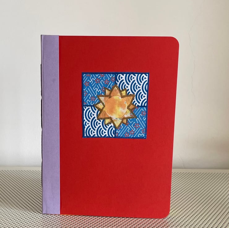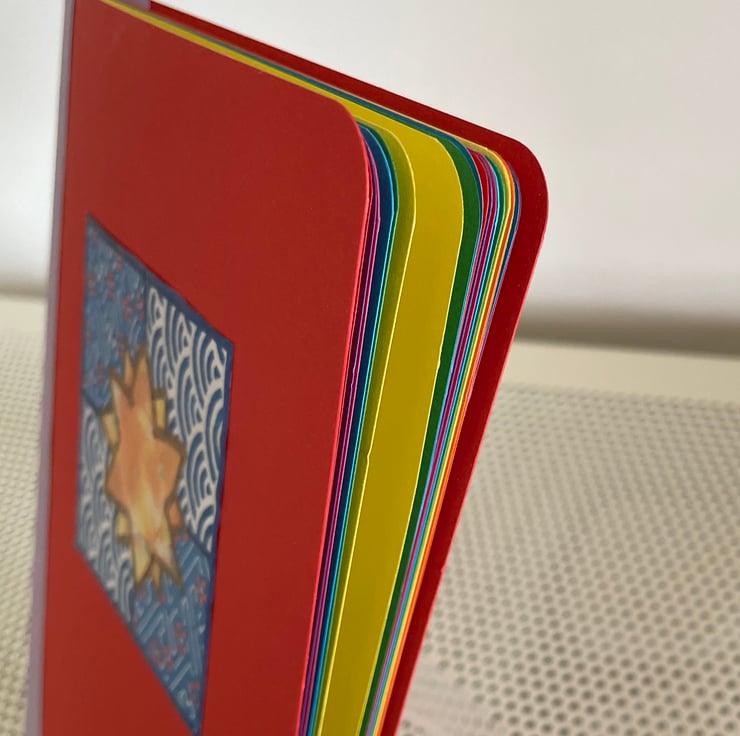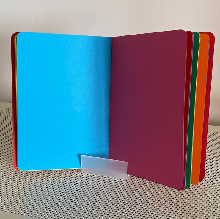 Approximately A5 sized this notebook is hand constructed from colourful card and paper. It contains two book blocks of coloured premium paper which are hand stitched to the spine.