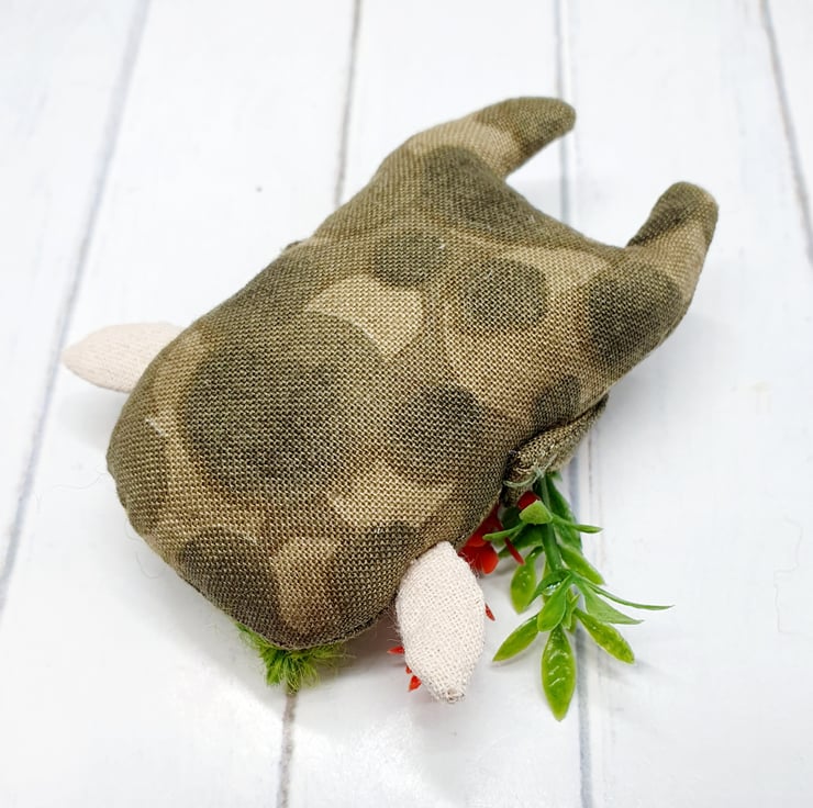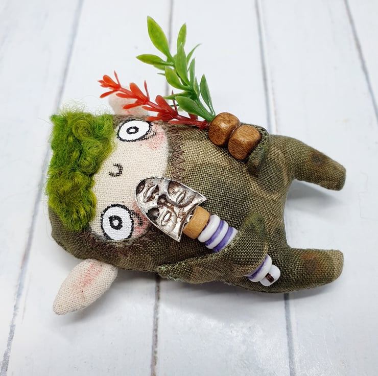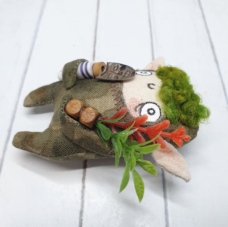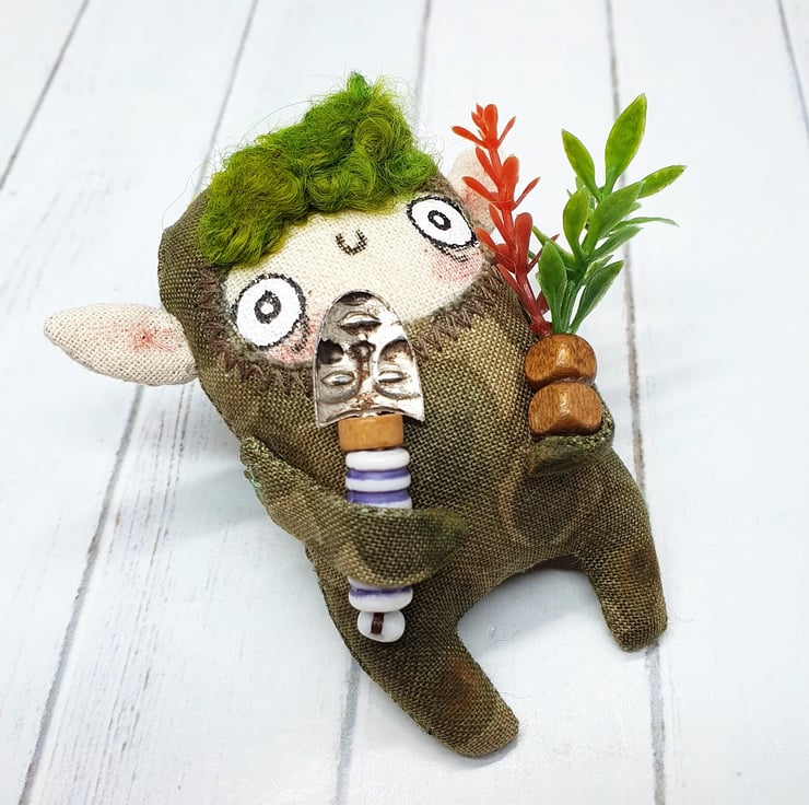 Plant potting Brownie has upcycled bead spade in its arm and holds upcycled bead plant pot with faux plants in the other arm. This little Brownie has hand dyed wool locks hair and hand painted face. Brownie measures roughly 7cm tall. This is for decorative purposes only and not a toy.