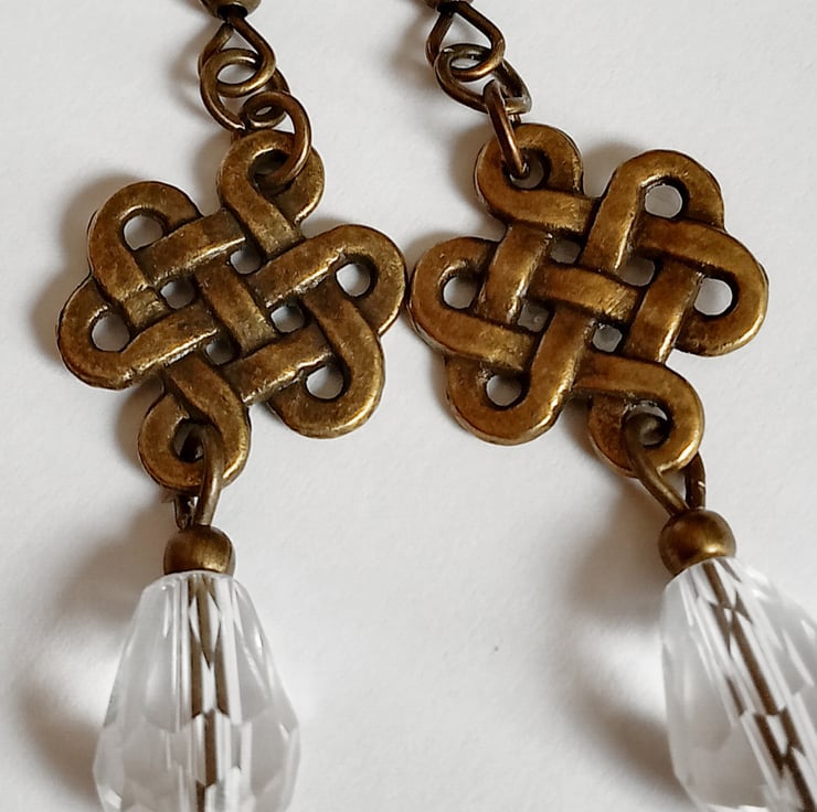 These nice earrings have Celtic knots and clear crystals hanging on bronze hooks.