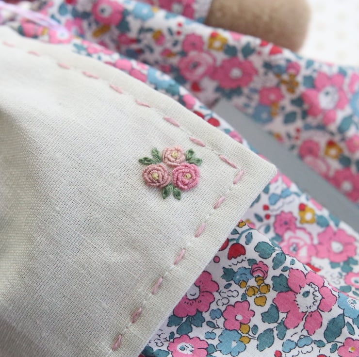 She is wearing a removeable dress made from beautiful Liberty of London fabric in Betsy Ann dark pink with a little Peter Pan collar.