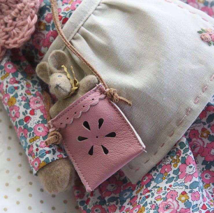 Her accessories include a tiny leather bag, hand punched with a daisy design and containing a baby bunny with a ric rac tie.
