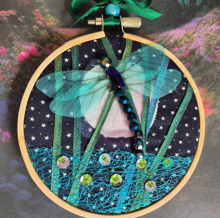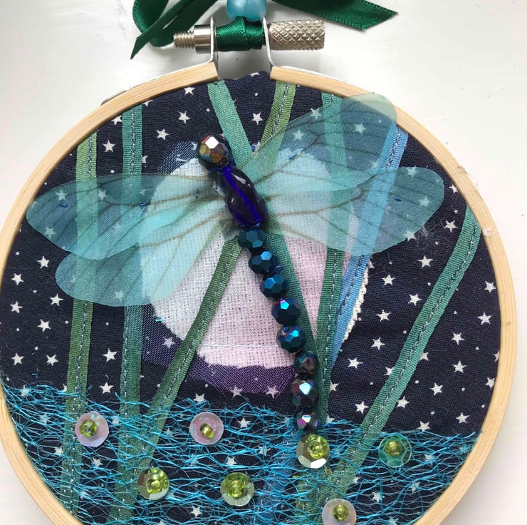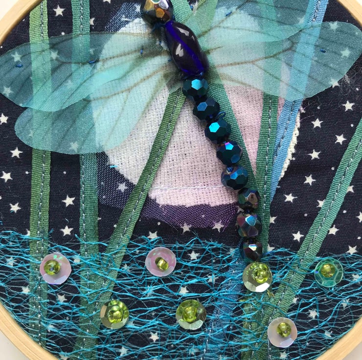 Navy cotton fabric with tiny white stars is the background. Cream linen with organza covering forms the full moon . Silk ribbon is stitched over the background, net is added, sequins with beads stitched on . The dragonfly has organza wings and beaded body .