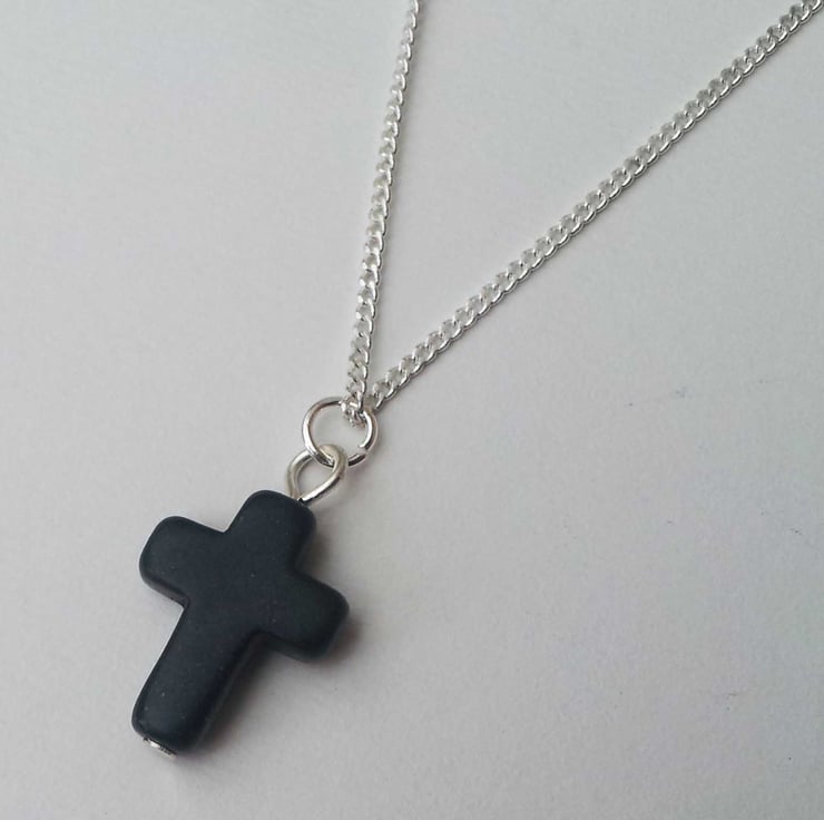 This nice necklace has a black agate cross on 18" silver plate chain.