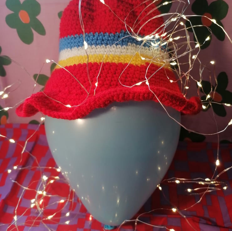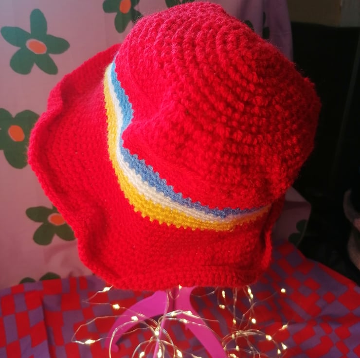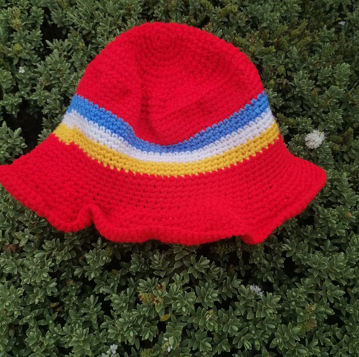 Handmade crochet rainbow bucket hat - made with love, perfect for festivals! Poppy red, sunny yellow, white and sky blue bucket hat with a cute striped rainbow pattern.