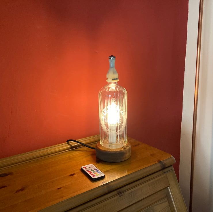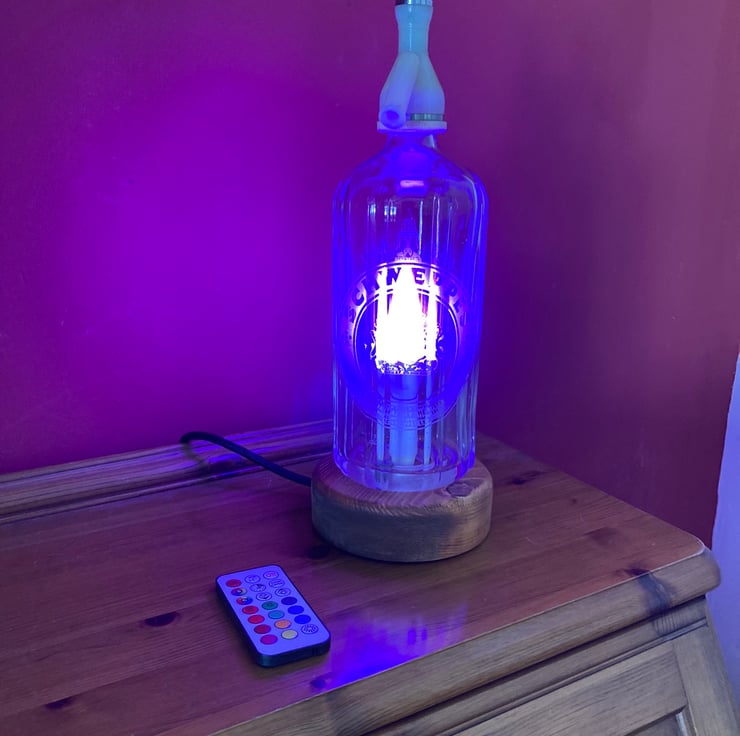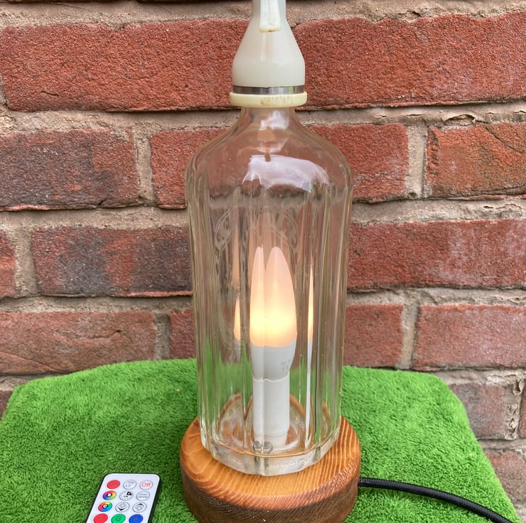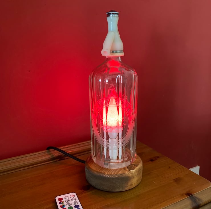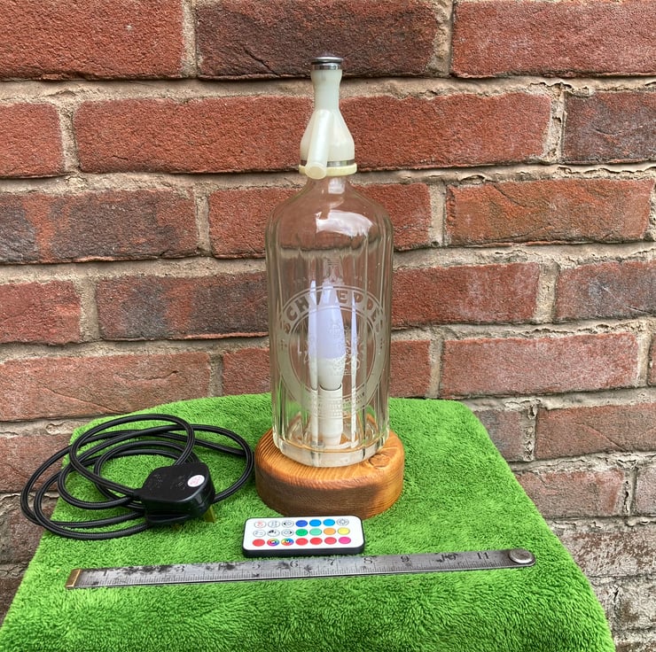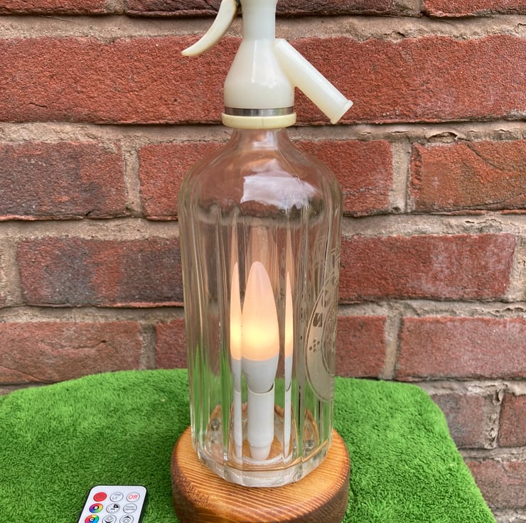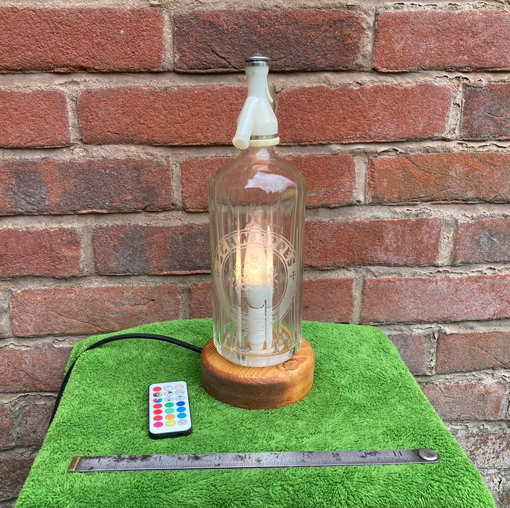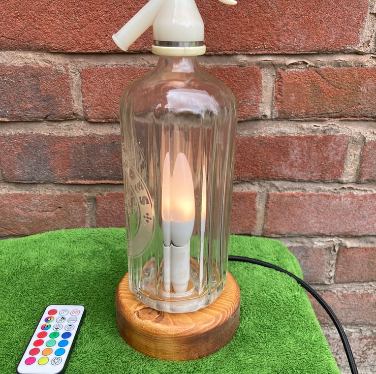 Give your home some sparkle with this upcycled 1970s soda syphon table lamp with its 3-Watt remote-controlled LED colour change bulb which can be switched on and off, dimmed, set to one of sixteen steady colours or to cycle through the colours in either strobe or fade modes.