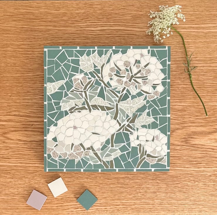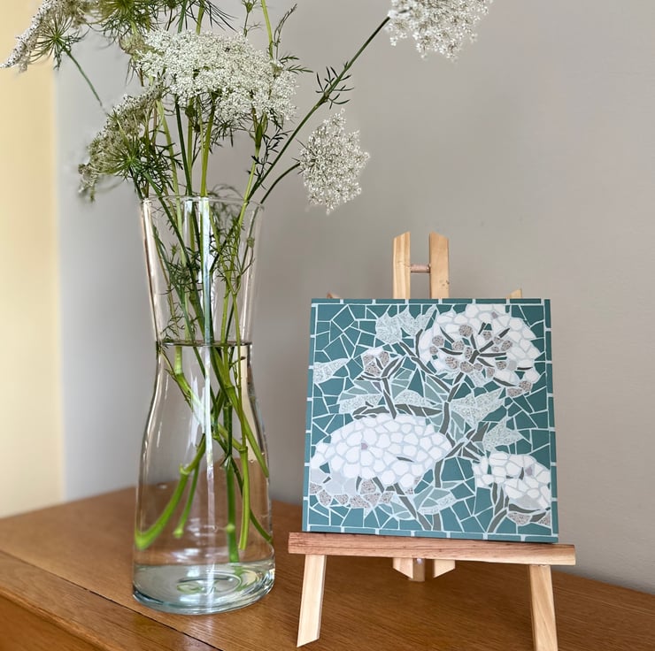 I created a mini meadow in my garden and the Wild Carrots are the star of the show. They are only annuals but seed themselves all over the place creating foamy seas of white. Some have even escaped the garden and it makes me smile every time I see them. I had to think long and hard how to replicate their delicate form but I’m really pleased with the outcome. It is also the first time I have tinted my own grout and used the dark green background. I’m looking forward to creating more.