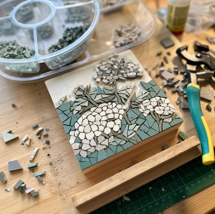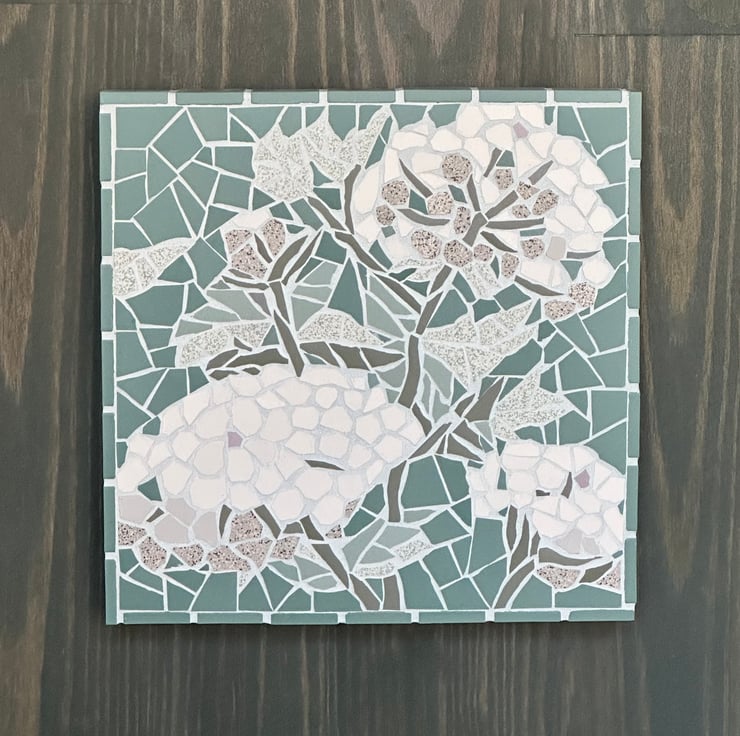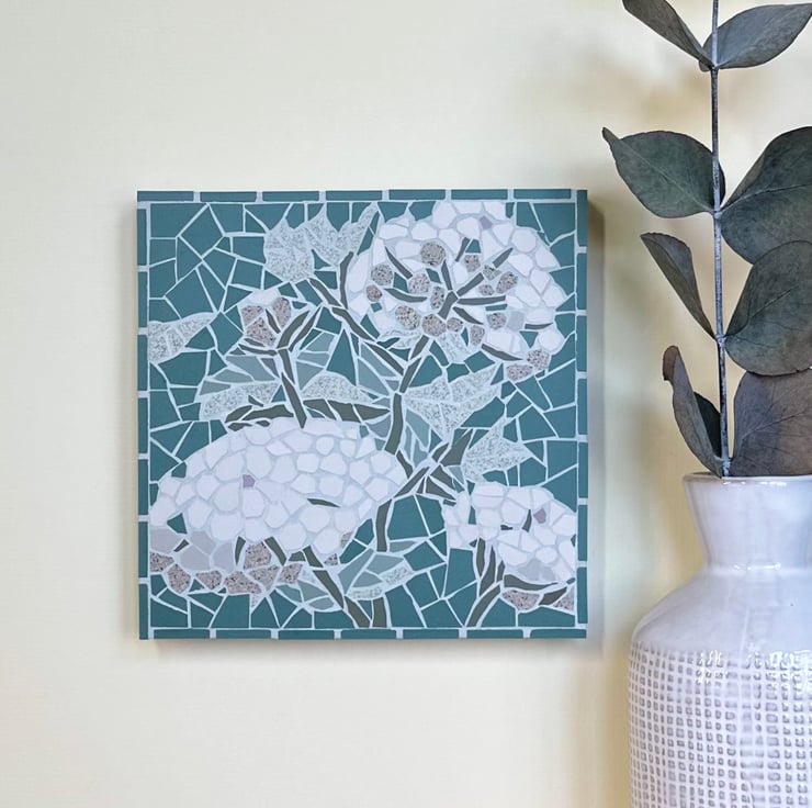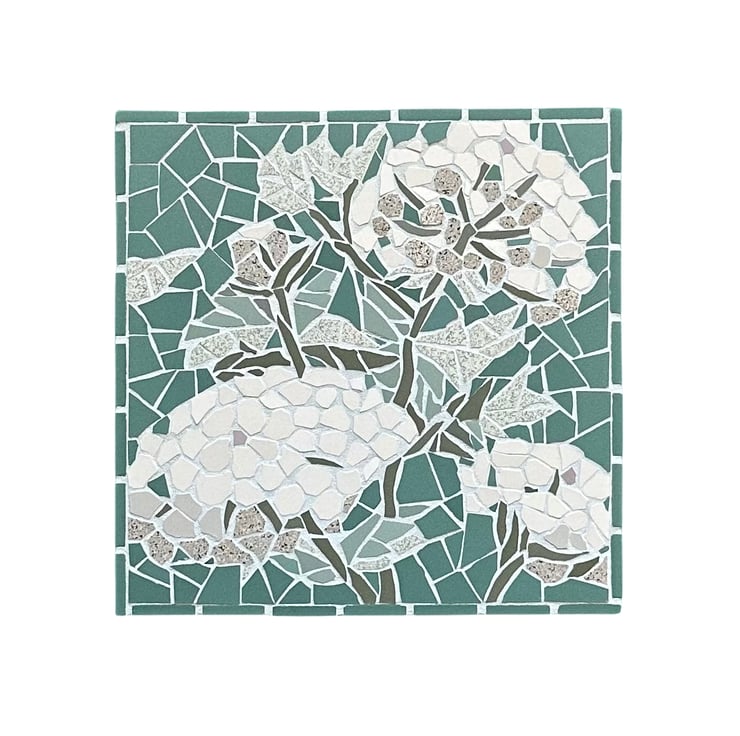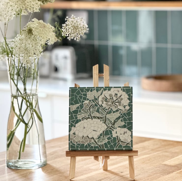 I use beautiful Winckelmans tiles which are matt ceramic and come in soft muted tones. I hand cut each piece of tessera to create intricate images inspired by nature. The mosaic is mounted on a wooden canvas and the sides are part tiled to frame the plaque and give depth and is complete with hanging wire.