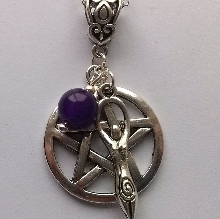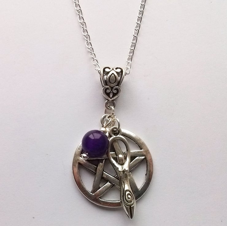 This nice necklace has a goddess charm and amethyst bead hanging over a large pentagram on silver plate 18" chain.