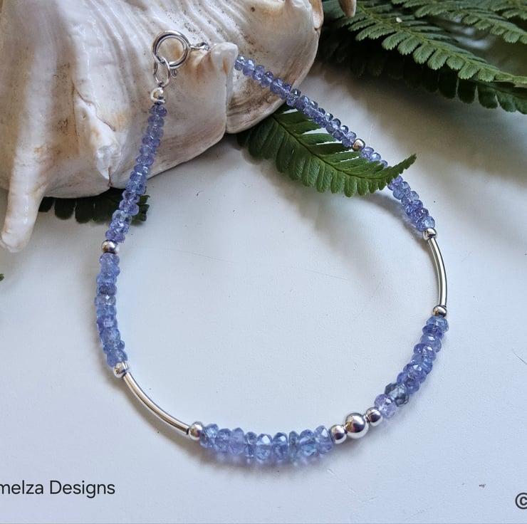 A beautiful bangle style bracelet designed and hand crafted in Cornwall using AA bead grade faceted tanzanite rondelle cut tanzanite gemstones. Tanzanite is the one gemstone which is mainly graded and valued on it's colour alone and now becoming expensive within the trade worldwide as all mines have closed in recent years.