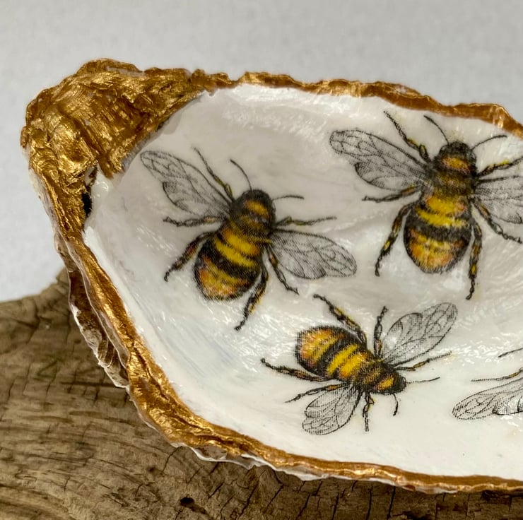 Who doesn’t love Pooh Bear?! This is for his fans. This shell features 4 little fat busy bees going about their daily bizzzzz of collecting pollen for their golden treasure. On a pearlescent background, this gives the shell a lovely pearly finish. The edge is finished in gold. A pretty little gift for any lady, whatever her age. A ring dish, keep your favourite earrings safe and paired up.