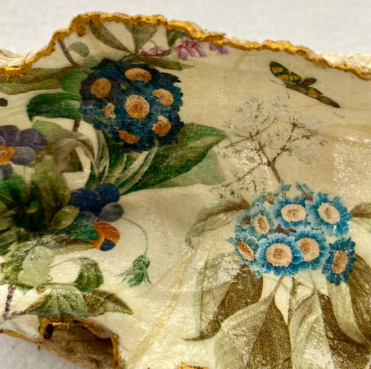 It is the method of layering different types of paper, tissue, building up layers and depth. Up to 40 layers of varnish were added and then it was very carefully sanded to achieve a mirror finish. There are 2 notable decoupeurs, Mary Delaney, she worked in the court of George III and Queen Charlotte, producing the most astonishing and detailed botanical artworks. Her work can be seen in The British Museum of Art. More recently, Liz Barker cam to the fore during the COVID pandemic, using materials such as masks, swabs and PPE.