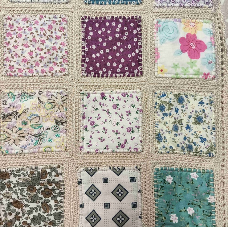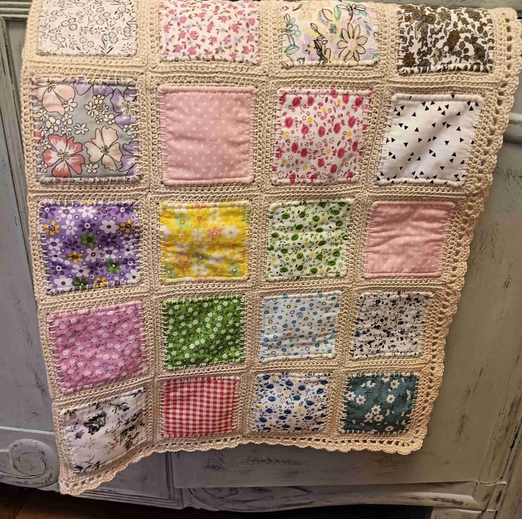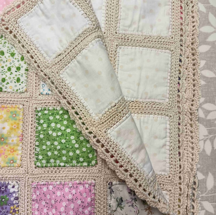 Handmade, cotton patchwork baby blanket with crochet edging.