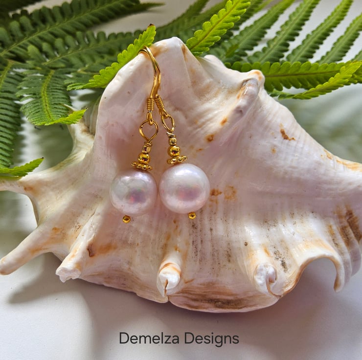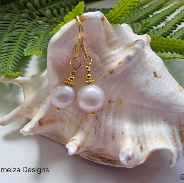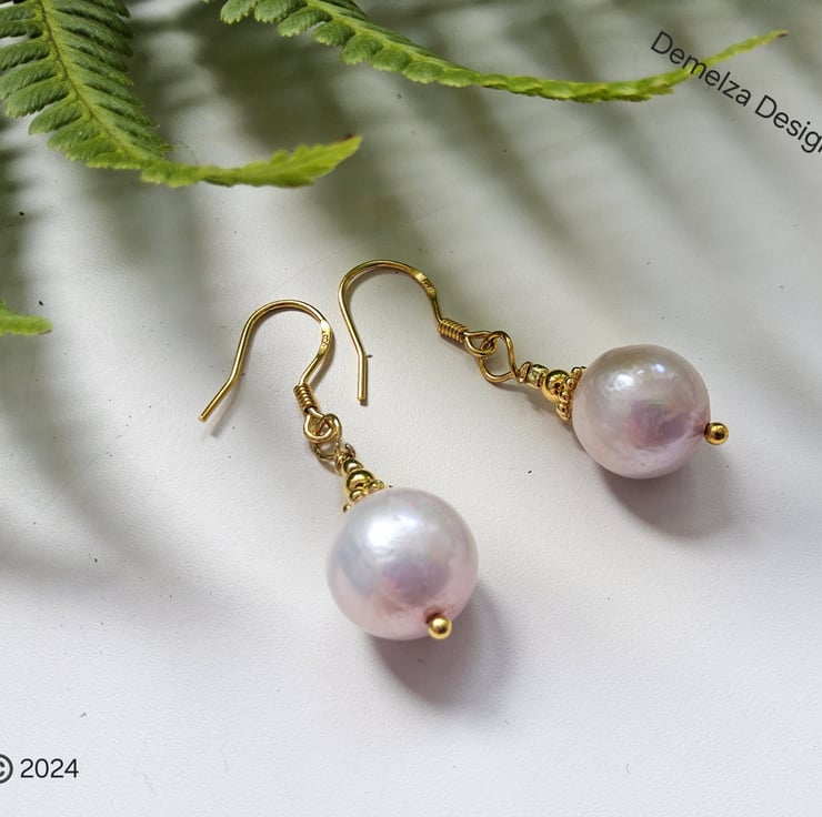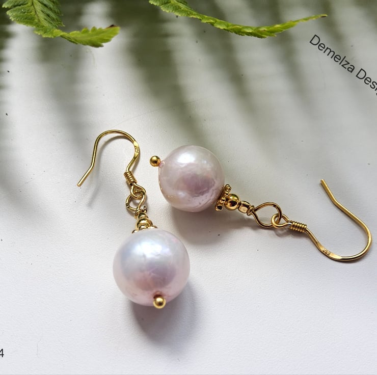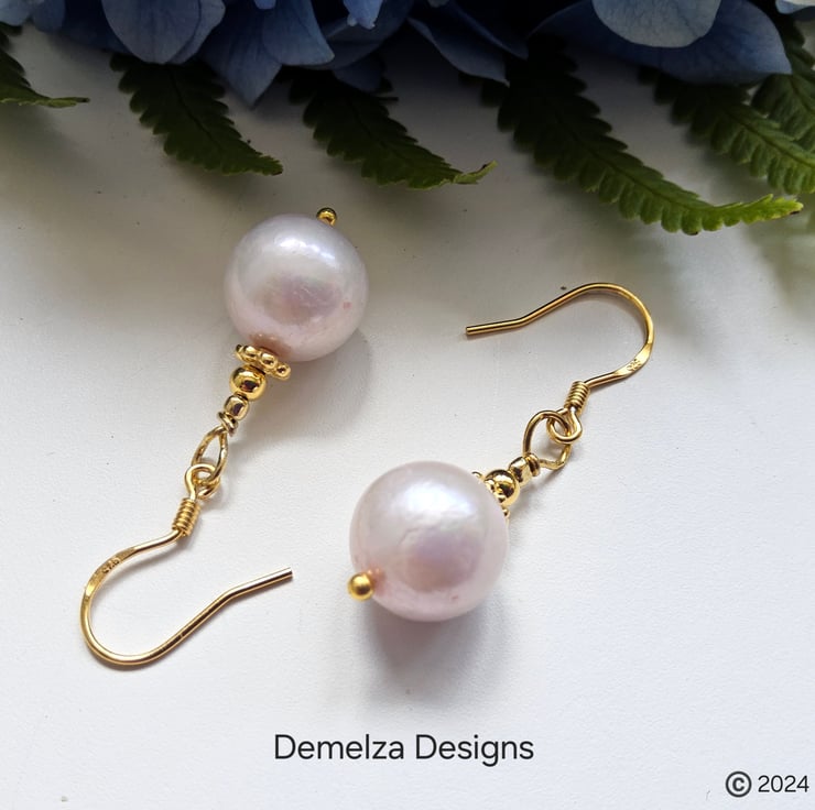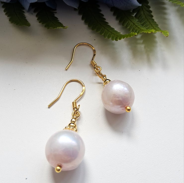 A lovely pair of hand crafted luxurious 12mm top quality near perfect round natural freshwater pearl earrings to wear on daily basis. They are made in Cornwall from all yellow gold vermeil findings. Gold vermeil is electroplated gold over 925 sterling silver. It is not the same as poorer quality gold plate over copper or brass. It illegal to use the term vermeil for the latter!