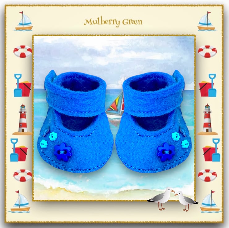 A sweet little pair of marine blue shoes, decorated with little flowers, to fit the Mulberry Green characters. The shoes look lovely with the little dresses.