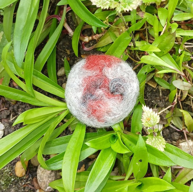 A circular brooch in red and shades of grey. This brooch is needle felted using hand dyed and natural Gotland fleece. It is approximately 5cm in diameter and has a metal safety catch on the back