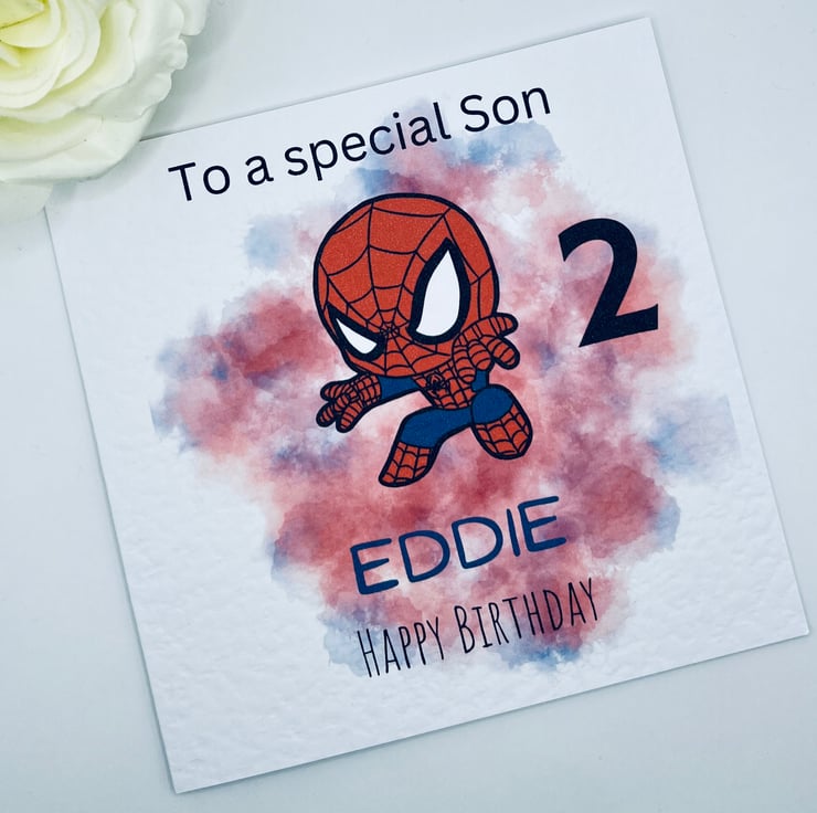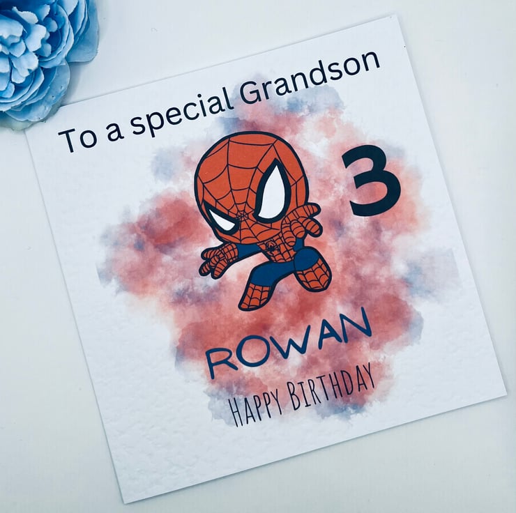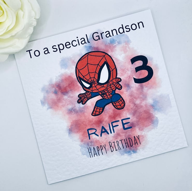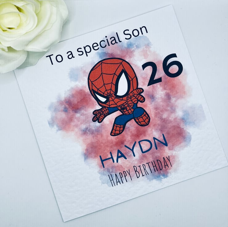 Personalised birthday card featuring a superhero character, choose your text, including name, age and relation.