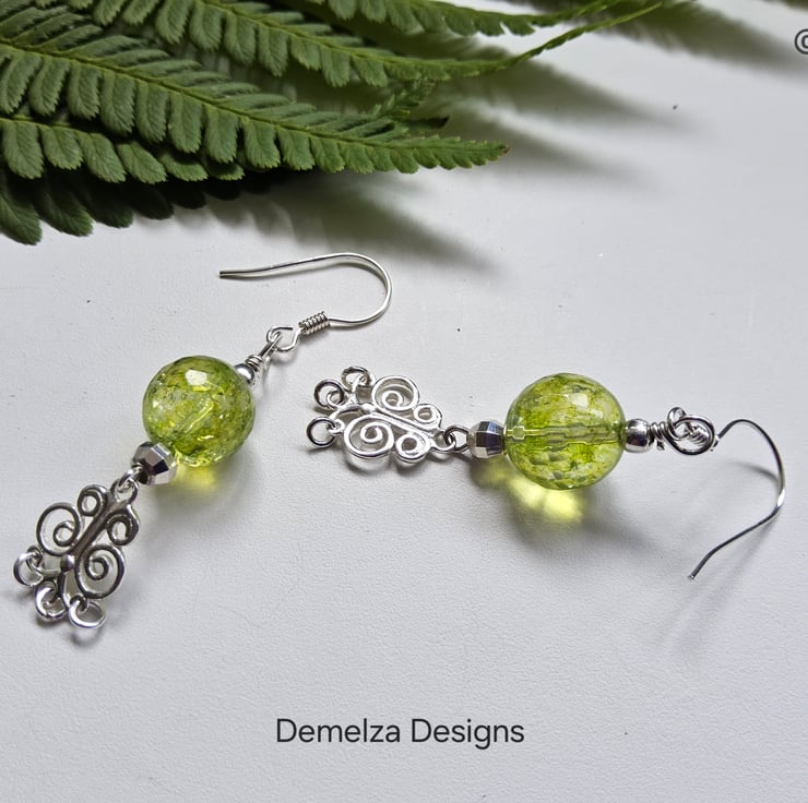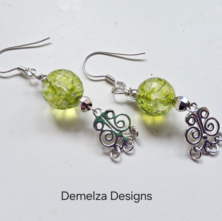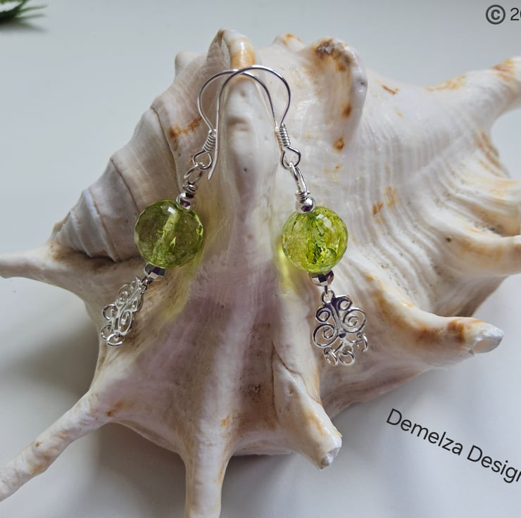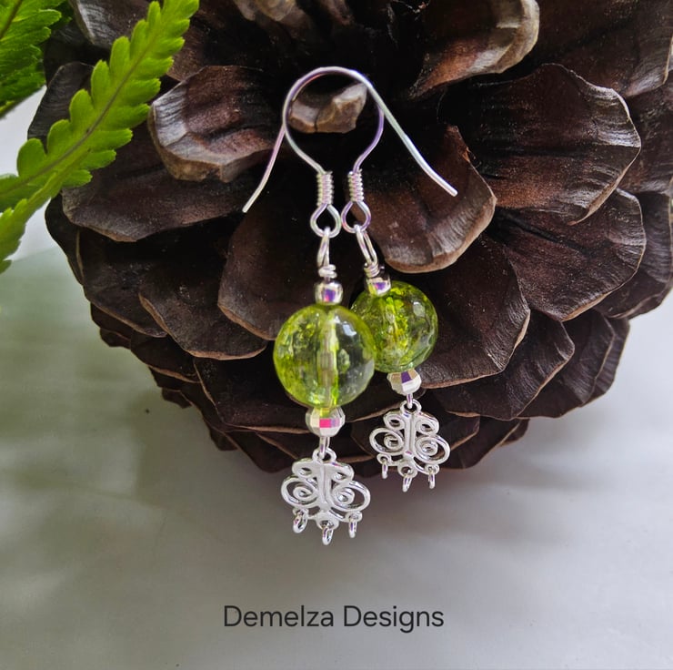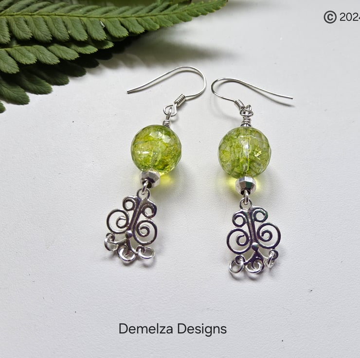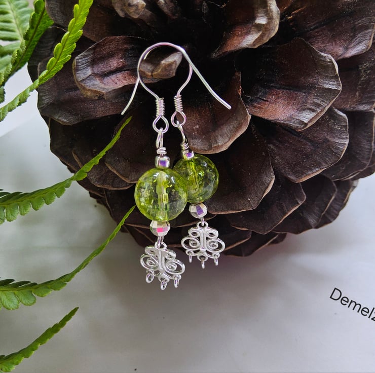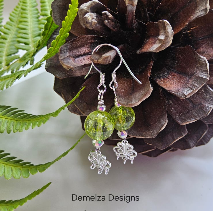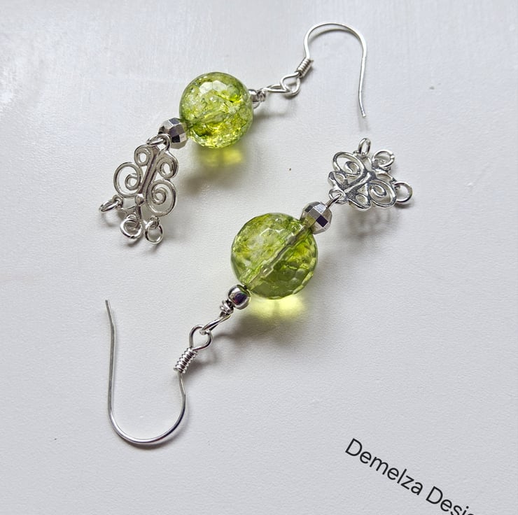 A sweet feminine pair of earrings designed and hand crafted in Cornwall using 10mm faceted round cut peridot rounds. To complement them decorative sterling silver filigree findings have been incorporated. All other components are 925 sterling silver.