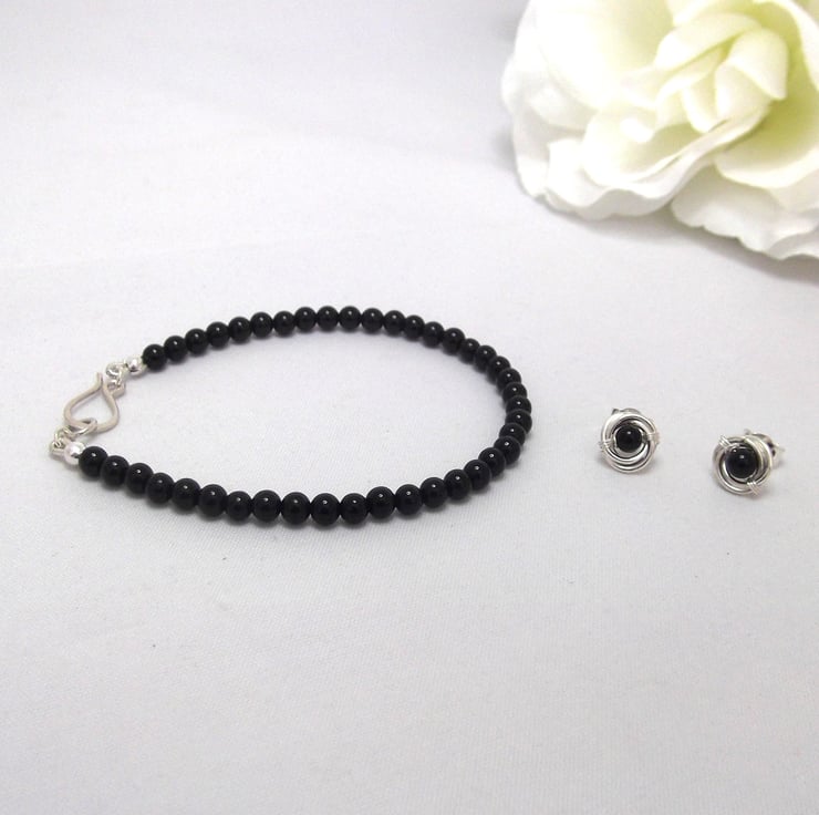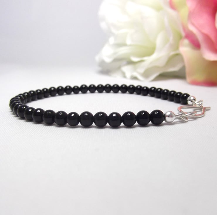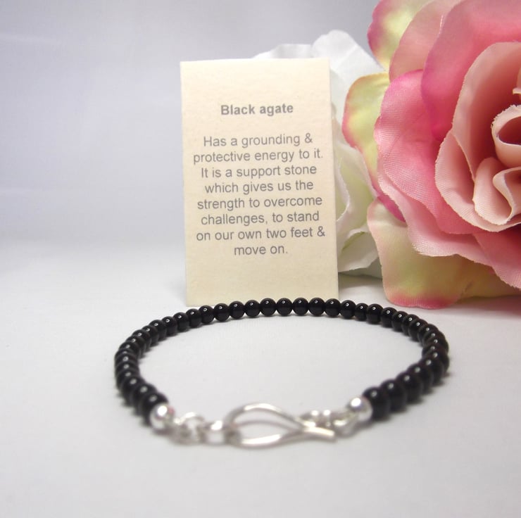 This delicate Black Agate gemstone bead bracelet features small round beads and a secure hook and eye clasp handmade from recycled sterling silver.