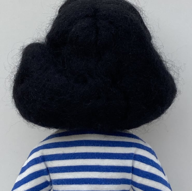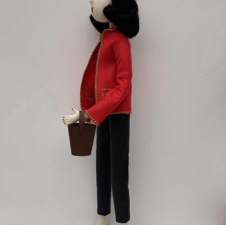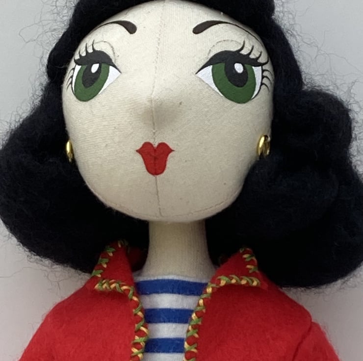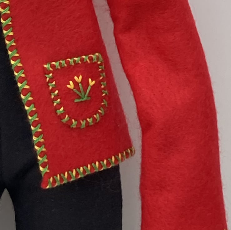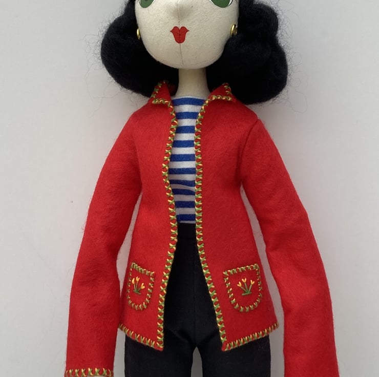 Her trousers and Breton top are made from vintage fabrics and her tourist jacket is hand embroidered on felt.