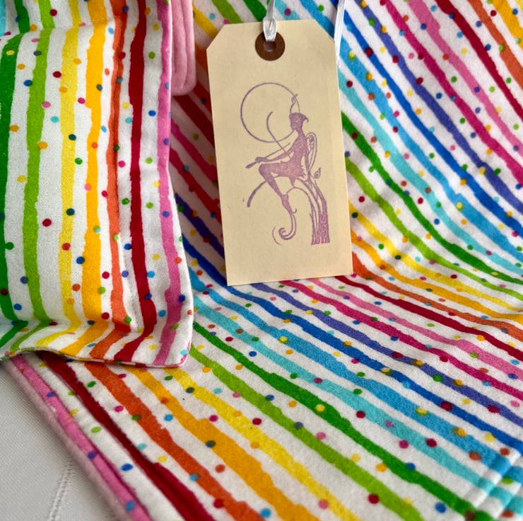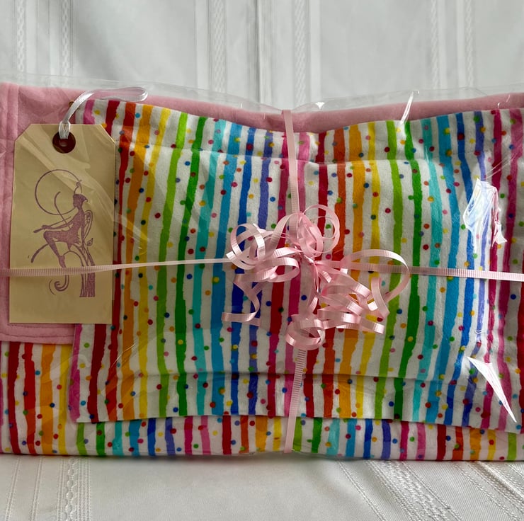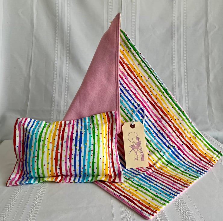 This lovely dolls blanket and pillow set in a Stripes pattern was handmade by me with the same care and skill I put into the full size baby blankets I make