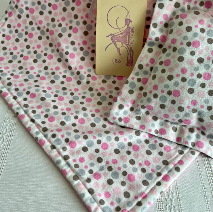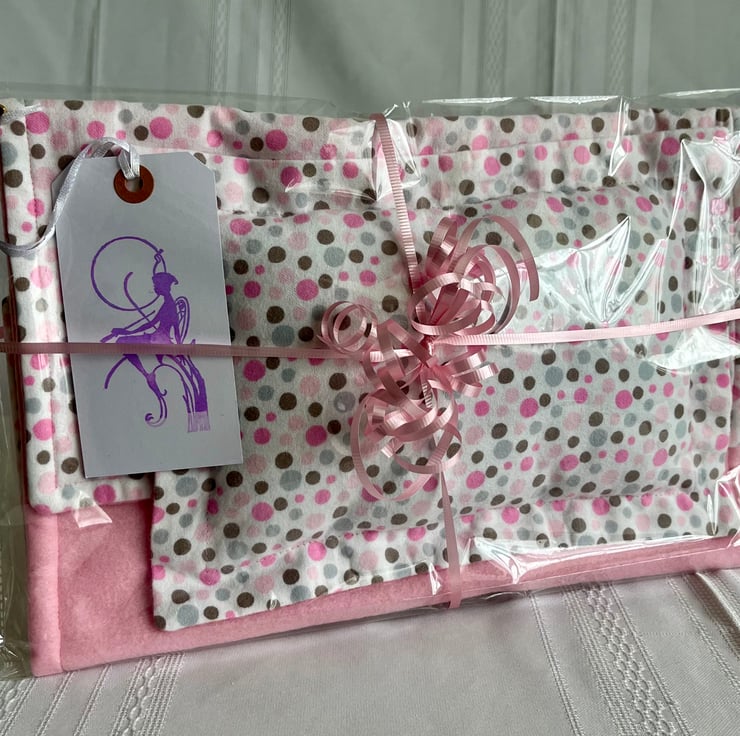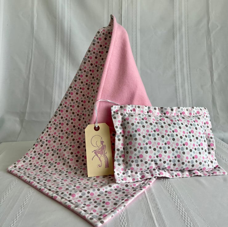 This lovely dolls blanket and pillow set in a Dots pattern was handmade by me with the same care and skill I put into the full size baby blankets I make