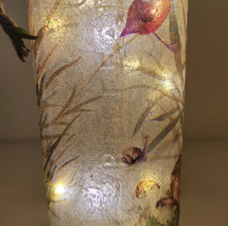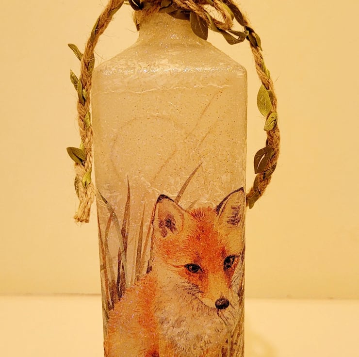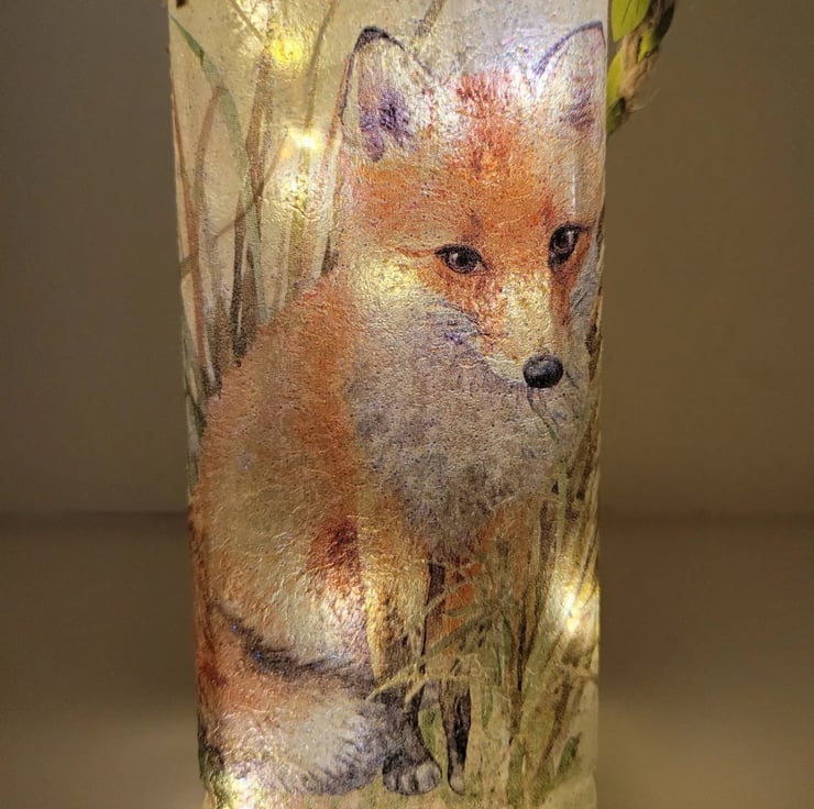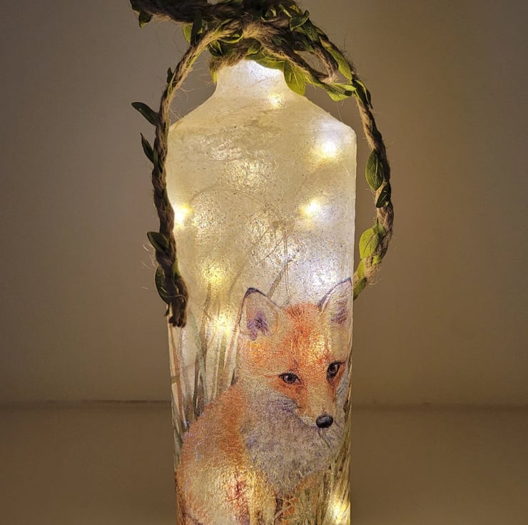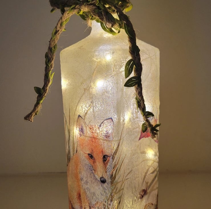 A stunning recycled item, this Fox bottle Lamp is made from a square shaped gin bottle with a gorgeous fox/wildlife decoupaged design.