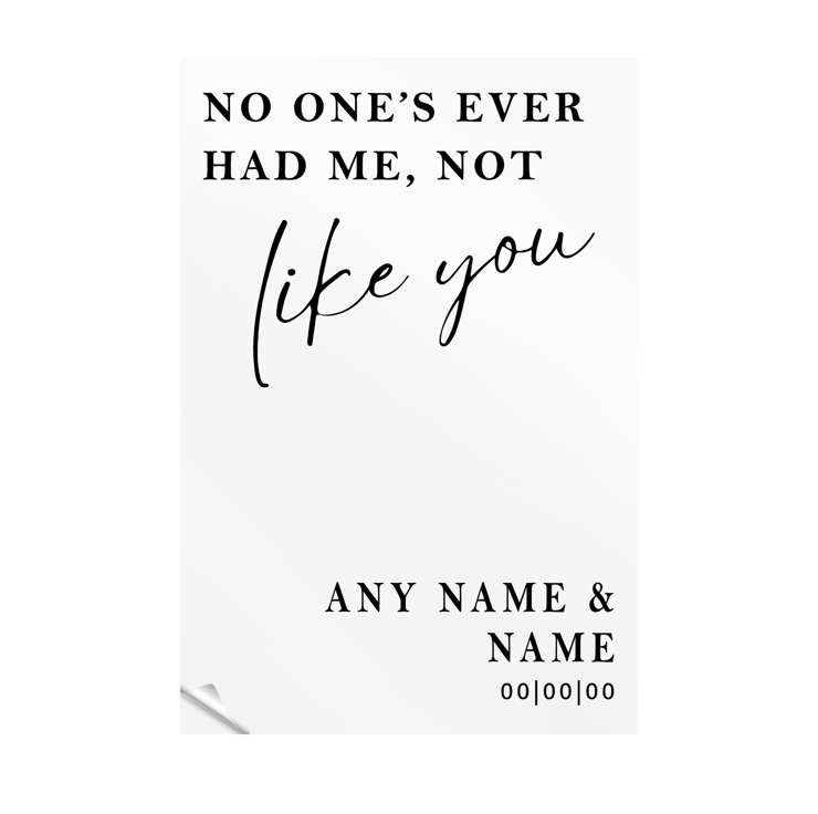 Celebrate your special day with a touch of elegance and personalization. Our custom DIY wedding mirror decal features the romantic phrase "No one's ever had me, not like you," inspired by the heartfelt song "So High School." This beautiful, minimalist decal is perfect for decorating mirrors, signs, or any smooth surface at your wedding venue.