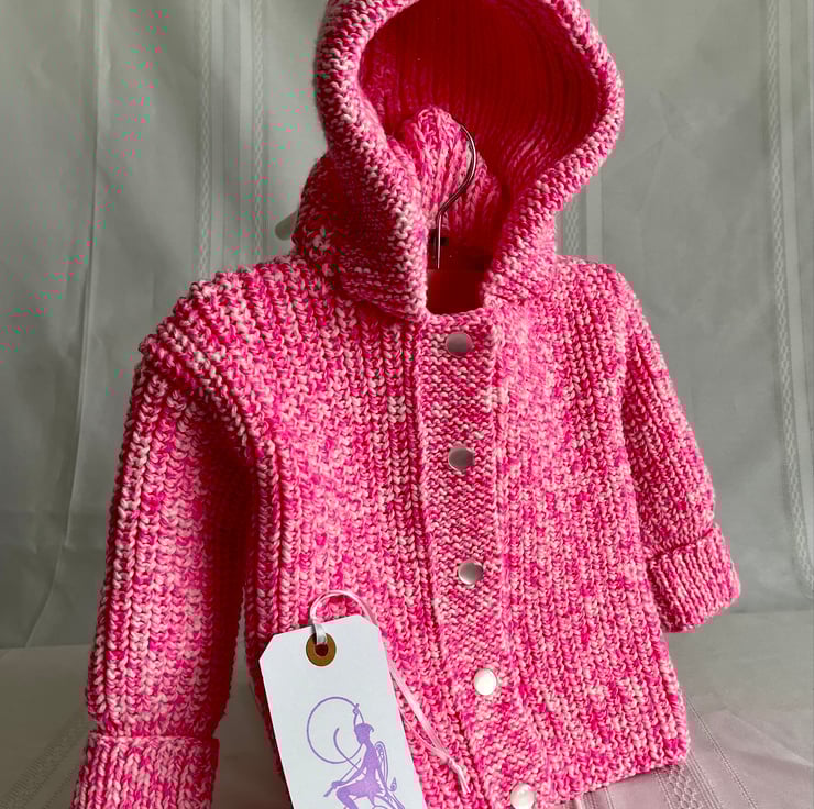 handmade hooded jacket ideal for a little girl aged between 3 and 6 months old. I began making and selling these lovely items with the birth of my first grand-daughter nearly seven years ago. although I have been knitting for my family for many years.