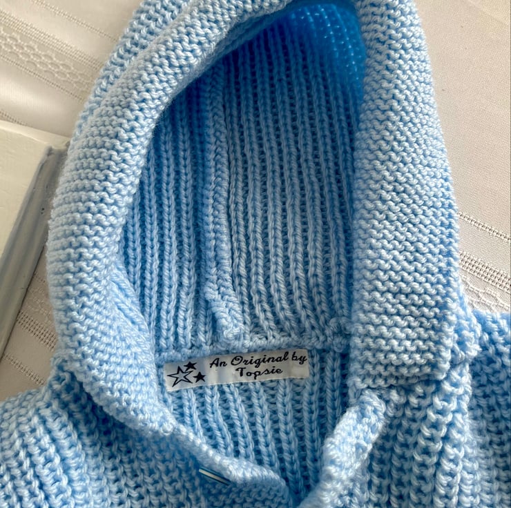 handmade hooded jacket ideal for a little boy aged between 3 and 6 months old. I began making and selling these lovely items with the birth of my first grand-daughter nearly seven years ago. although I have been knitting for my family for many years.