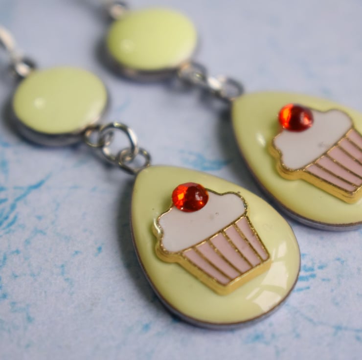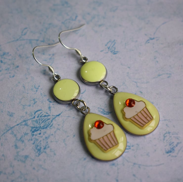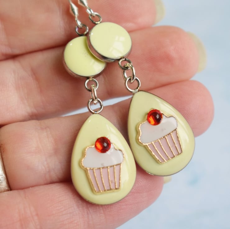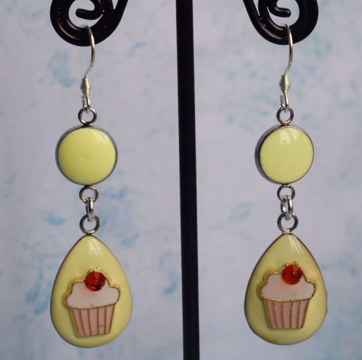 The little enameled cupcakes are set on a pale yellow background in a stainless steel teardrop setting. They are finished with tiny red rhinestones and then hung below round connectors in the same soft shade of yellow. The earwires are silverplated but you can swap to stainless steel or silverplated clip ons if you would prefer.