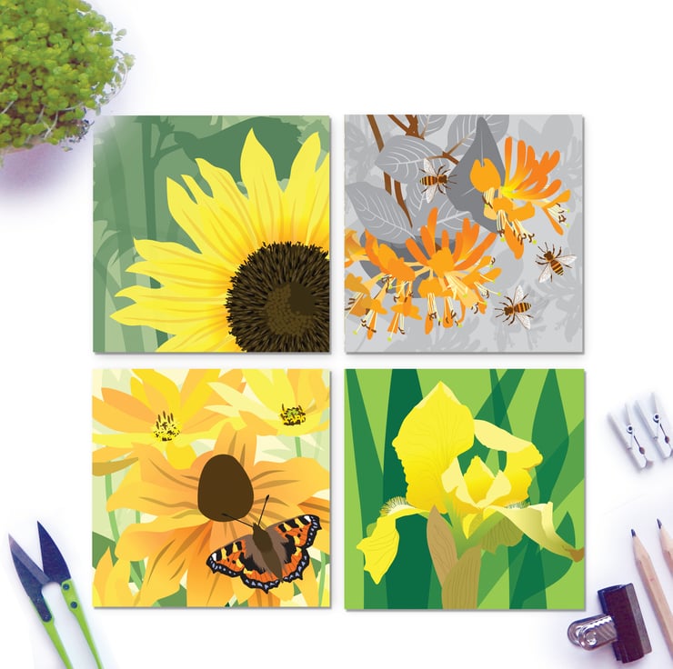 Pack of four yellow and orange floral cards featuring Summer flowers!