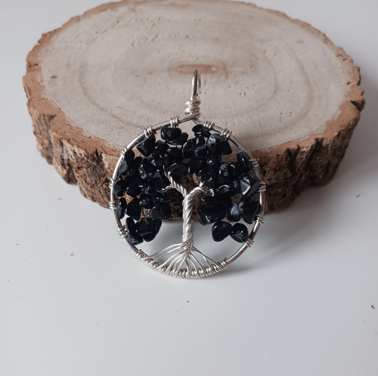 This handcrafted Wire-Work Tree of Life necklace is made with meticulous detail, featuring silver-tone wire intertwined with black onyx. With a pendant size of approximately 2 inches and a 20-inch chain, this piece is a perfect addition to any jewellery collection. Ready for immediate shipping.