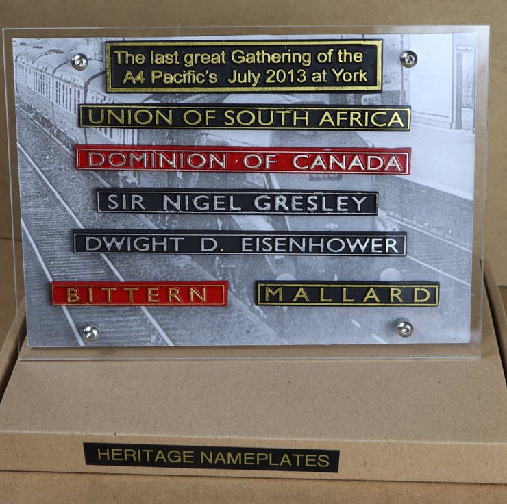 A framed display of the six nameplates of the A4 locomotives that took part in "The Great Gathering". Frame is supplied in its own gift box (letterbox size), and is able to be displayed free standing or wall hung. The frame measures 215mm x 150mm x 15mm There is a background picture of a faded image of an A4 locomotive in service pulling an express train. The nameplates are painted in the colours as they appeared at "The Great Gathering".