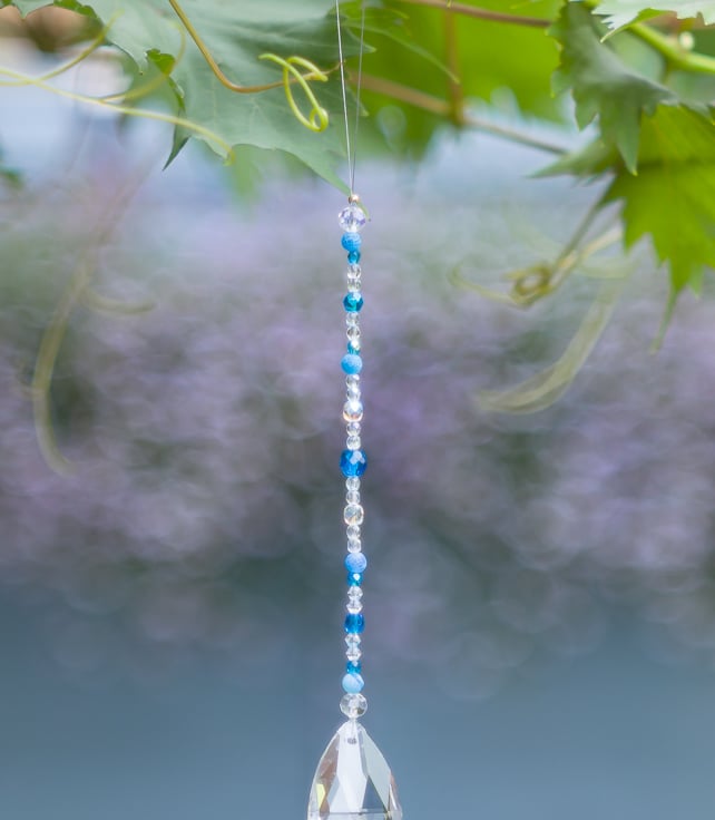 This pretty dangle suncatcher has been made with Swarovski, Preciosa and crackle glass beads. They are threaded onto strong jewellery wire and held in place with sterling silver crimp and bead.