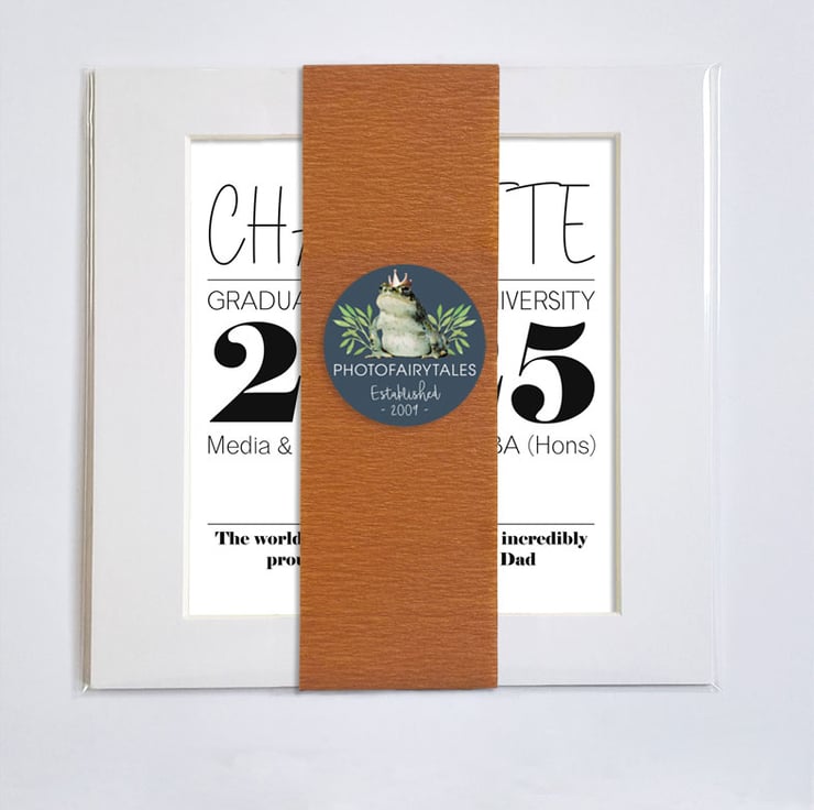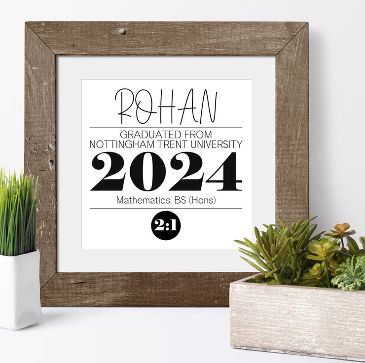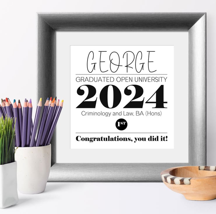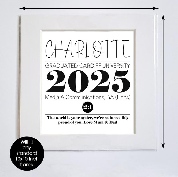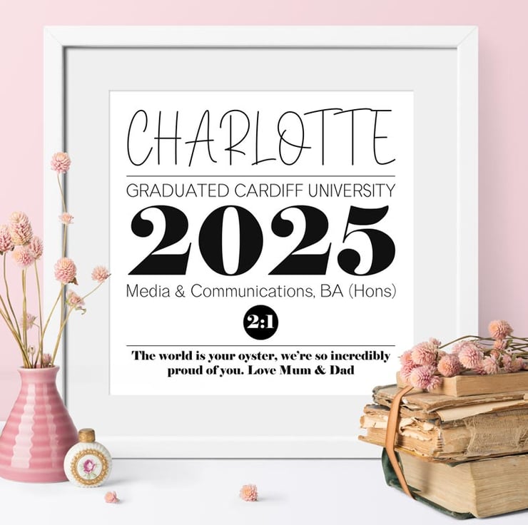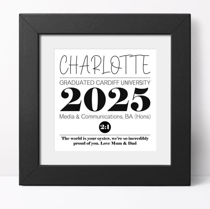 Personalised with their name, place and date of study, the grade they achieved and the course they studied. There's also space for you to add an optional personal or motivational message. The print is custom made and will be individually adapted to include the information you supply, therefore the layout will vary slightly. Created and printed to order on high quality gloss finish paper using archival quality inks.