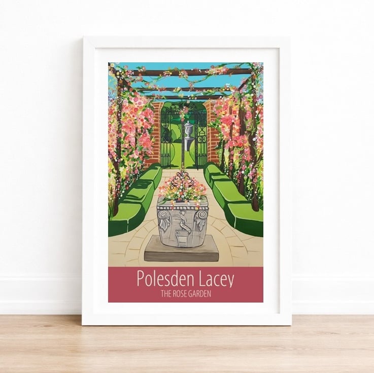 A contemporary travel poster style print of the Rose Garden at the National Trust -owned Polesden Lacey house, in Great Bookham, Surrey, from my own original acrylic painting. This image was originally commissioned for exclusive use by the National Trust, and used on prints, tea towels, and more, but is now available as a print direct from me. A perfect gift for those who love visiting Polesden Lacey!