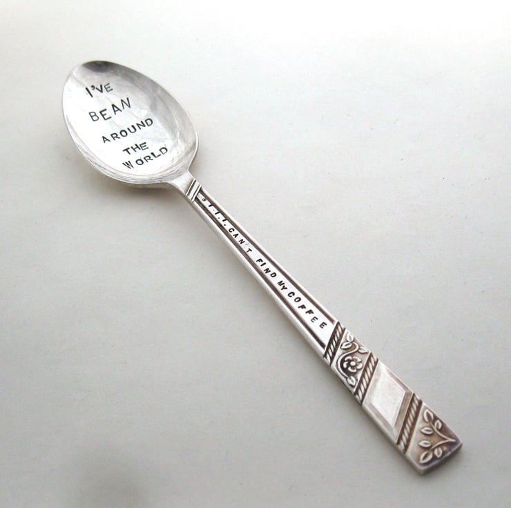 I couldn't resist. I'd just stamped a box of coffeespoons with assorted 'bean' puns and then I got earwormed by a classic... so here it is, handstamped on a vintage floral coffeespoon, 'I've Bean Around the World' in the bowl followed by '& I. I. I. Can't Find My Coffee' on the handle. I do love these spoons that will take stamping on the handles. I also love my teeny tiny letter dies that enable me to fit it in!
