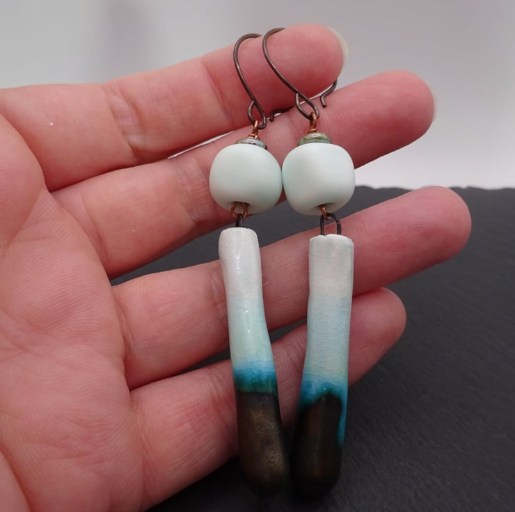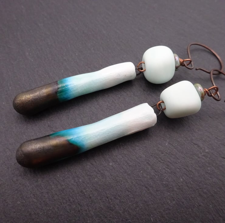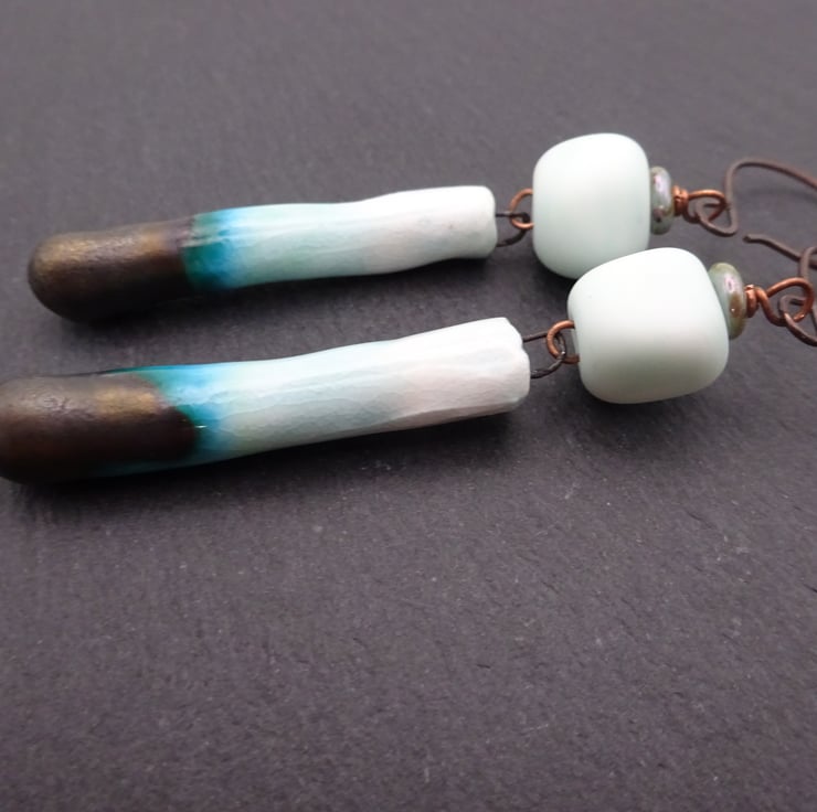 A pair of earrings made with handmade copper ear wires, handmade lampwork glass mint green nugget beads and handmade ceramic drops.