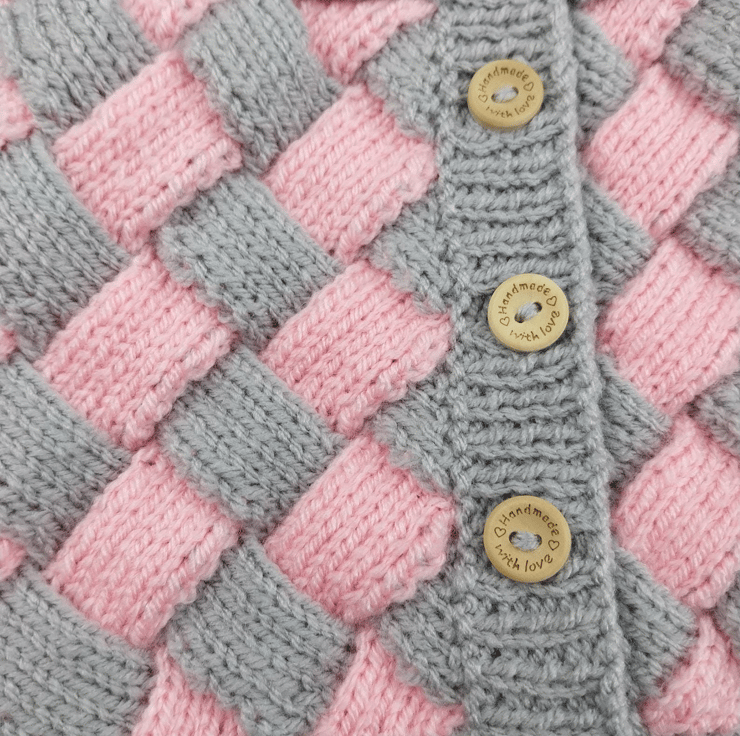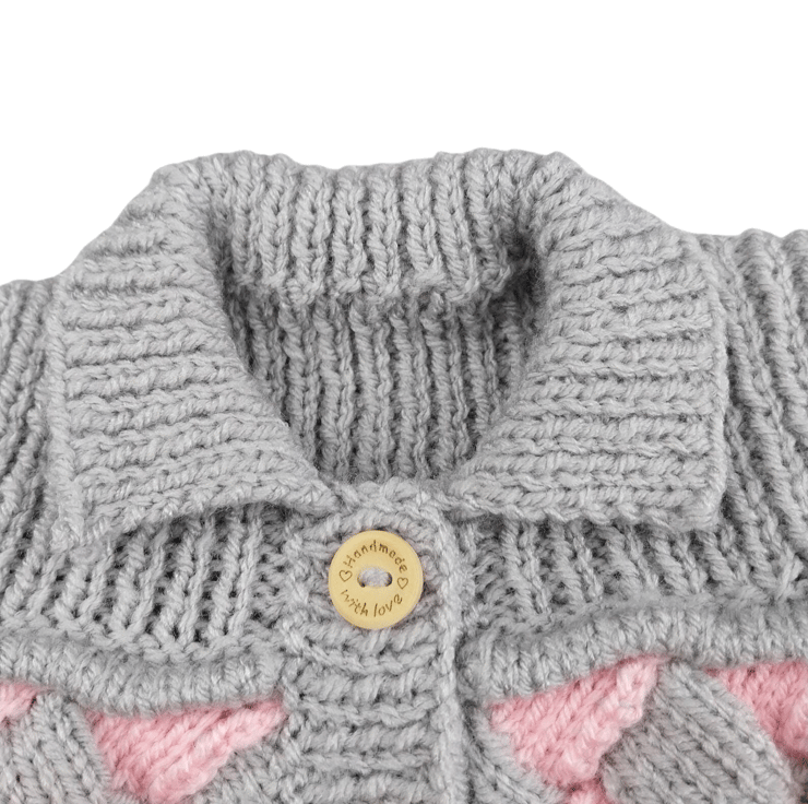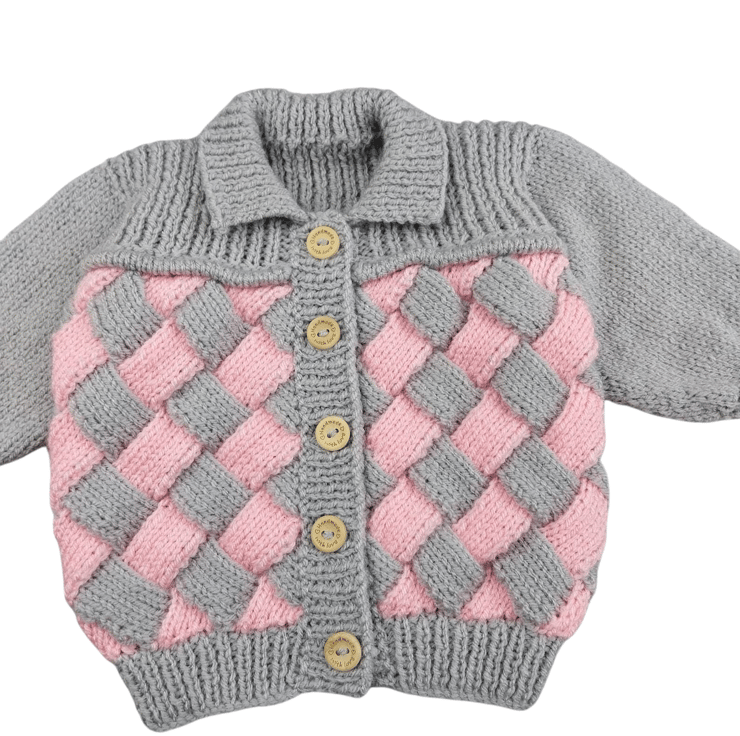 This hand knitted baby cardigan is full of warmth, comfort and charm. Featuring a beautiful woven pattern in soft pink and grey, it’s perfect for keeping little ones cosy while looking adorable.