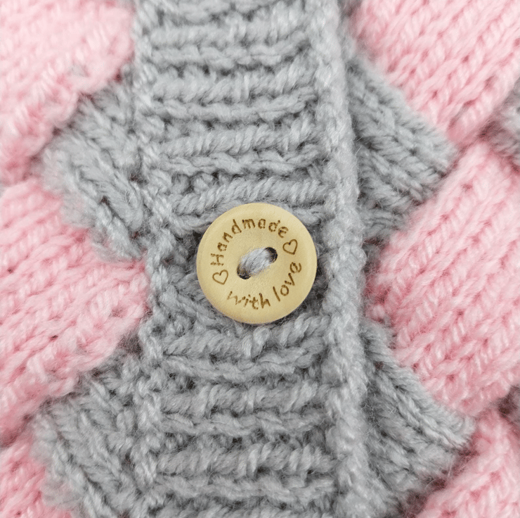 Each cardigan is carefully hand knitted using soft, baby friendly acrylic yarn that feels gentle against delicate skin. The front fastens with wooden buttons engraved with the words handmade with love, making it easy to pop on and off.