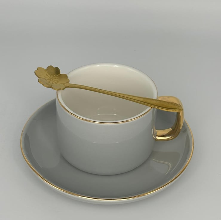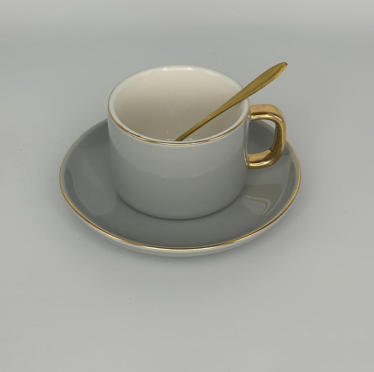 See our other listings to choose from either a Black or White Marble effect cup and saucer set, or a White, Grey or Pink Pastel set complete with gold rim and adorable stirring spoon.