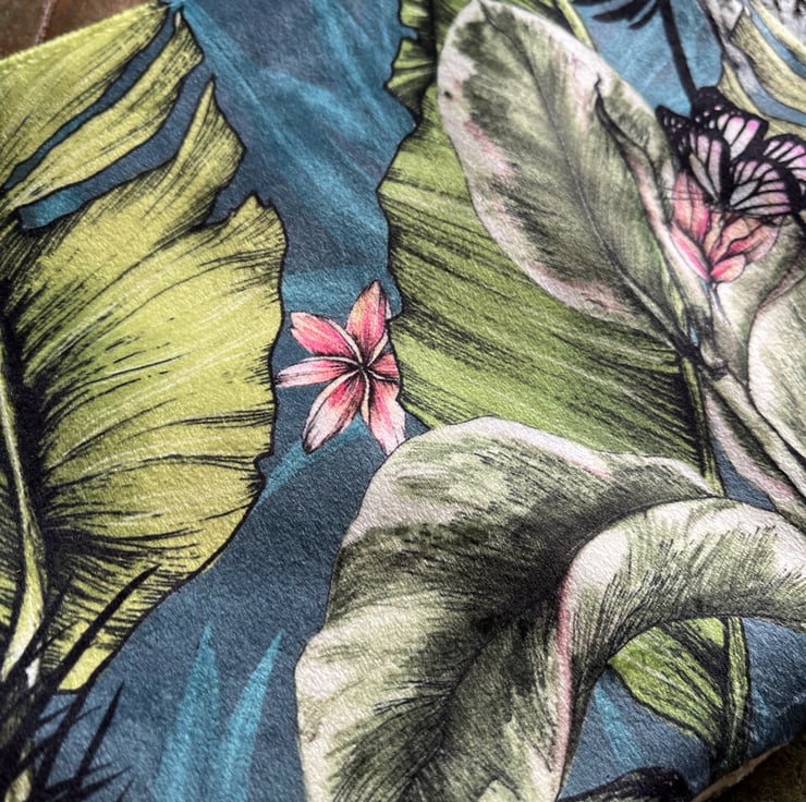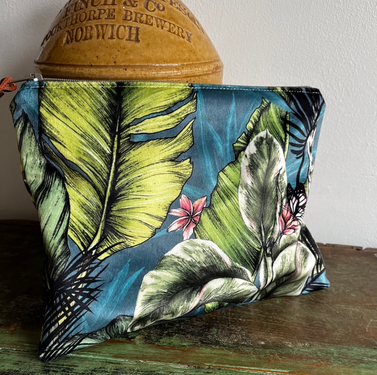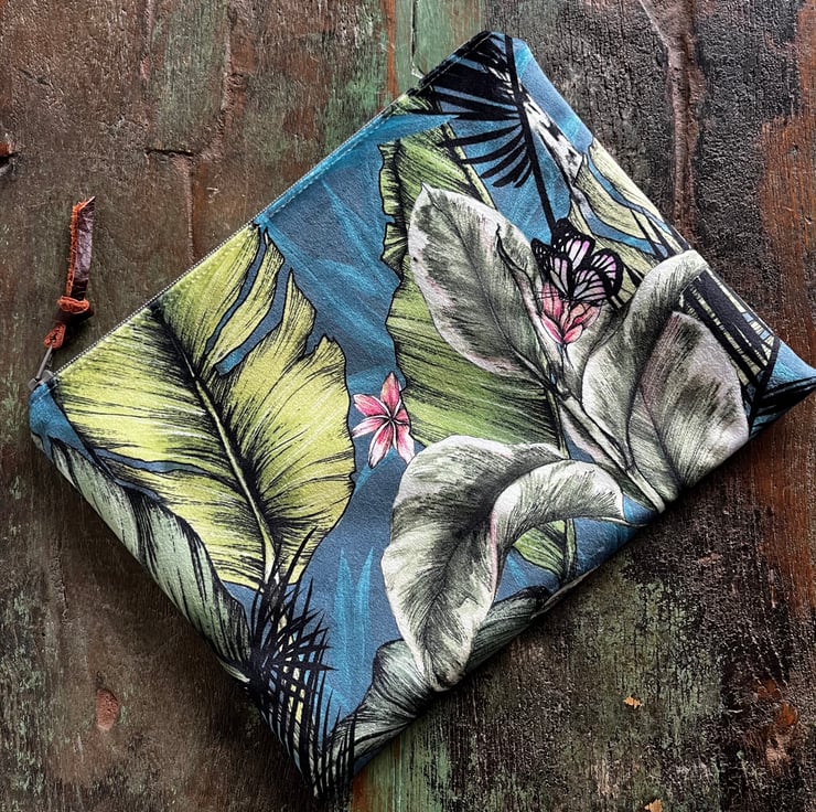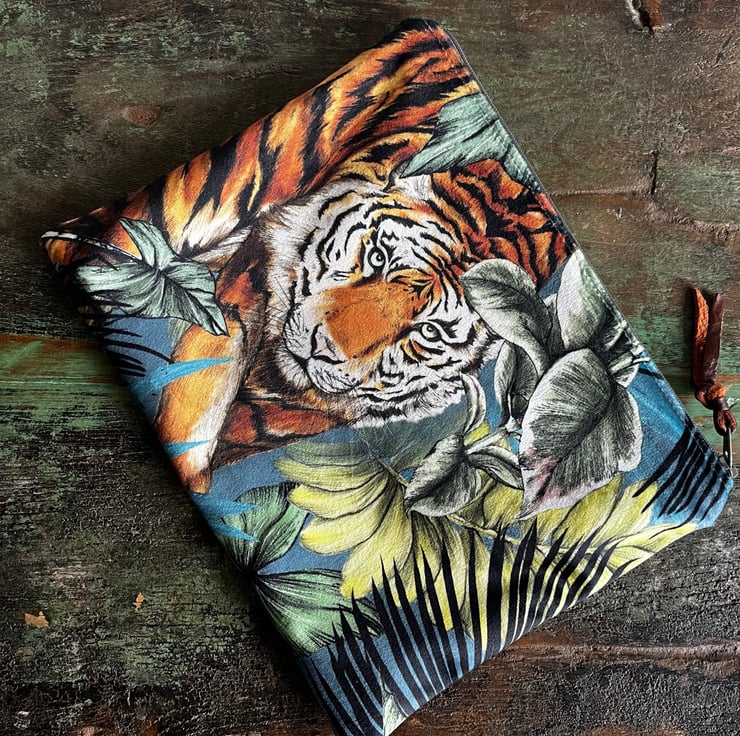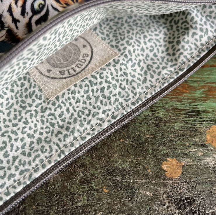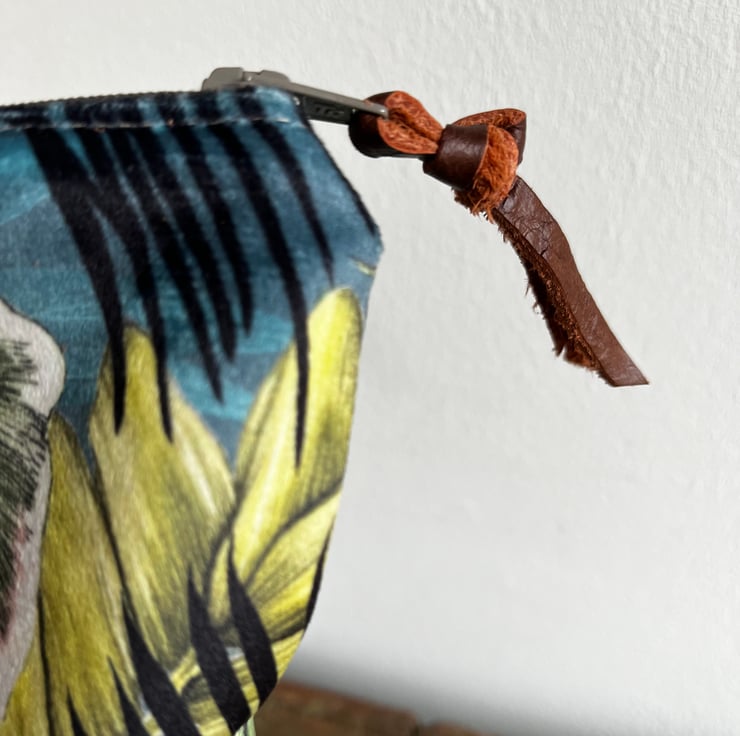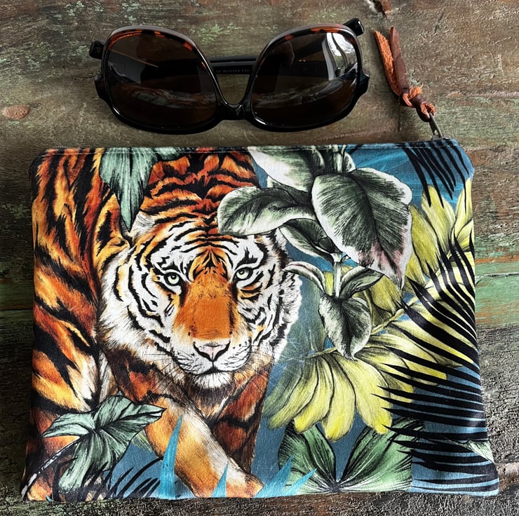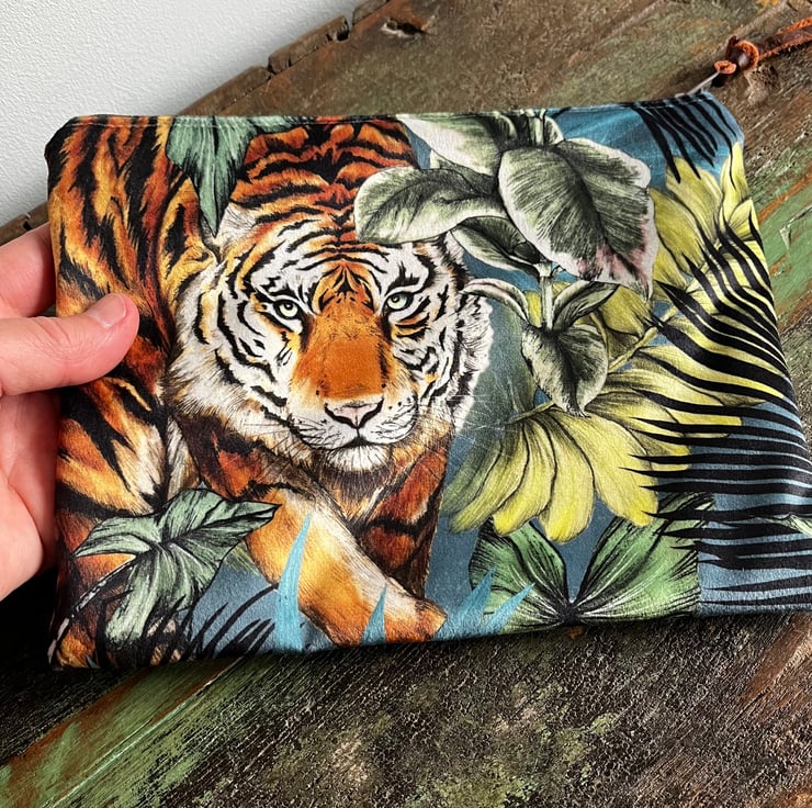 Handy pouch made from beautifully soft velvet with a tiger, bird and lush leafy design. The pouch is velvet front and back and it is lined with cotton with a mini leopard print. It’s a great size for organising bits in your handbag, or maybe for keeping small craft projects and notions tidy.