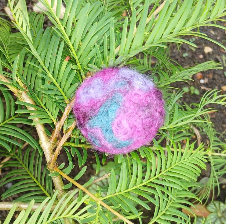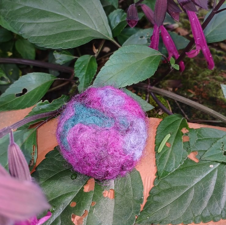 A circular needle felted brooch made with Gotland fleece. The colours are pink, lilac and turquoise. The brooch is approximately 5cm in diameter and has a metal safety fastening on the back.