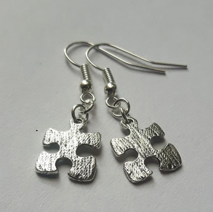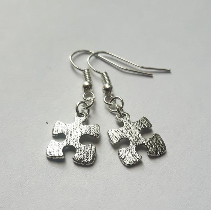 These nice earrings have jigsaw pieces hanging on silver plate hooks.