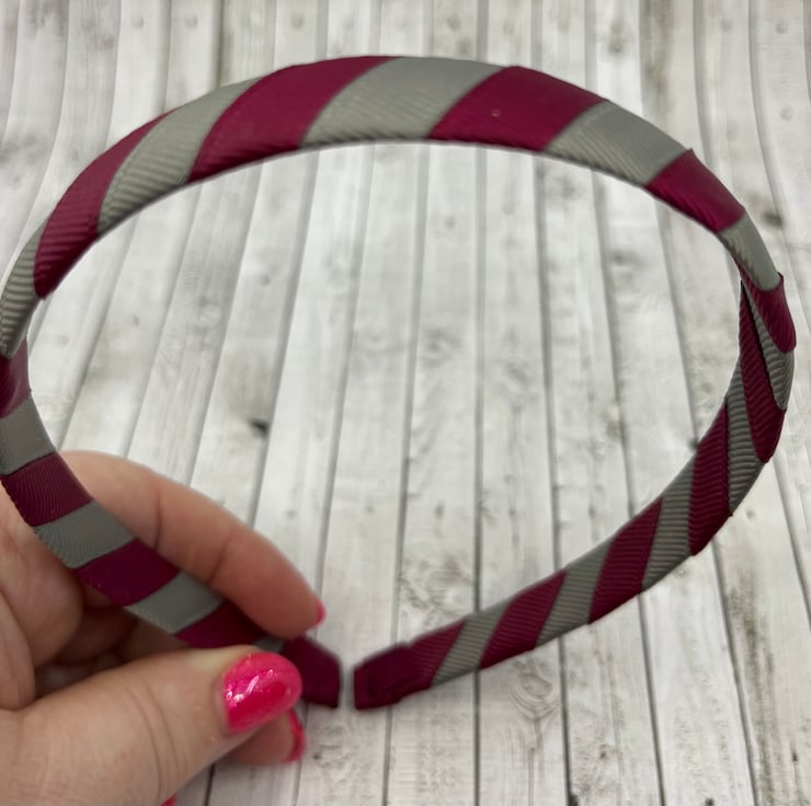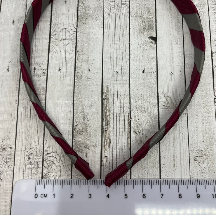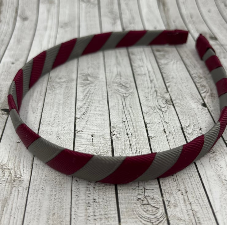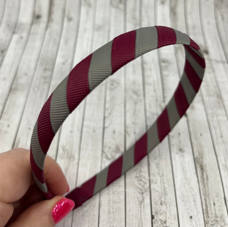 Our wine and grey Ribbon 1.8mm striped head band is made with excellent quality grosgrain ribbon. It will match beautifully with your little one's school Uniform and keep those little stray curls out of your little one's eyes.