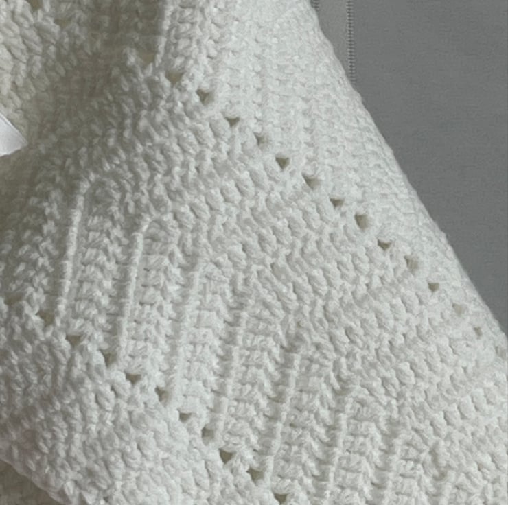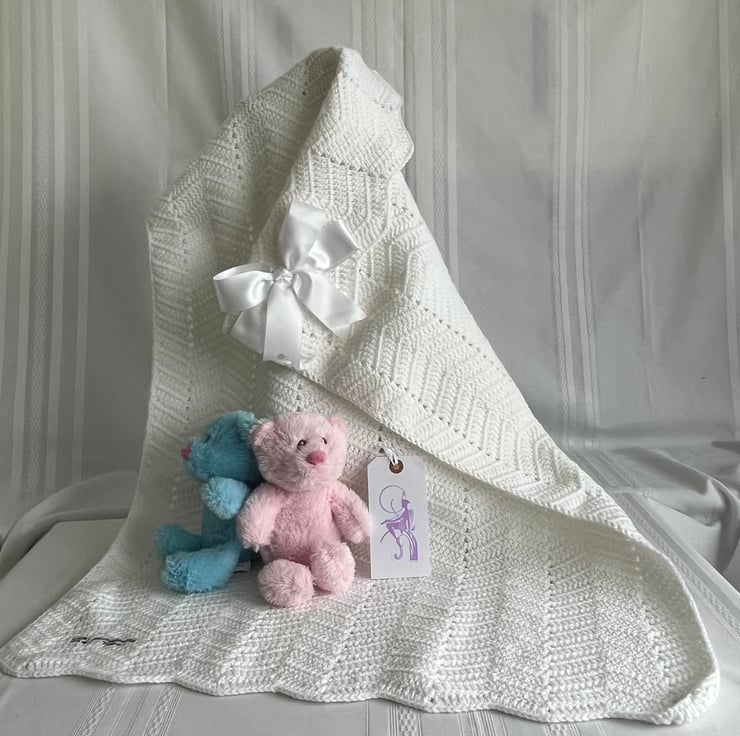 You will keep your baby or toddler really warm with this knitted blanket made from Bernat Sport wool in White in a chevron pattern.It was hand-made by me and is ideal for either a little girl or boy.