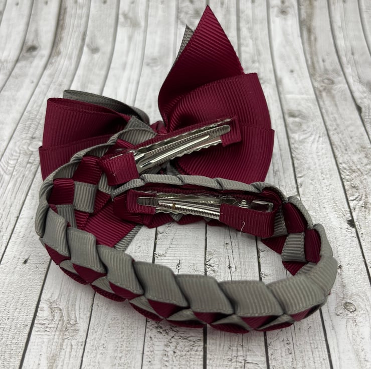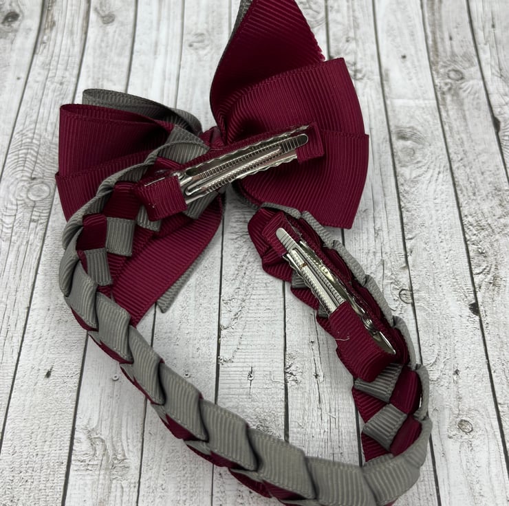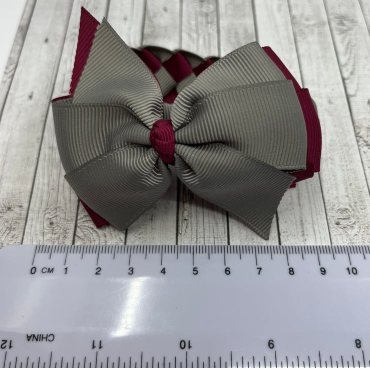 Our wine and grey Bunwrap is handmade here in our little shop. It is made from the best quality Grosgrain ribbon. The Bunwrap is really elegant and look extremely smart wrapped around your little one's bun. It clips in at the front of the bun then the tail wraps around the bun and clips beneath the bow at the front to complete the look, tail is 21 cm.