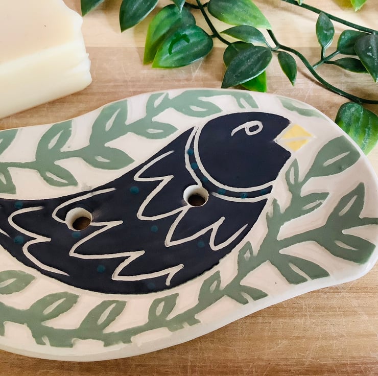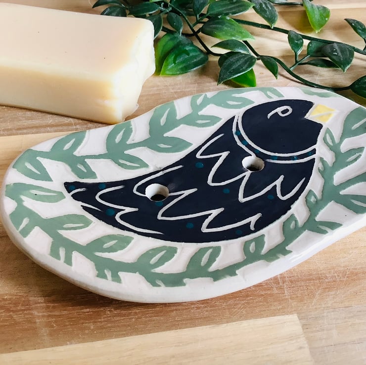 A gorgeous addition to any bathroom, with its lovely little Black bird nestled in amongst the leaves.